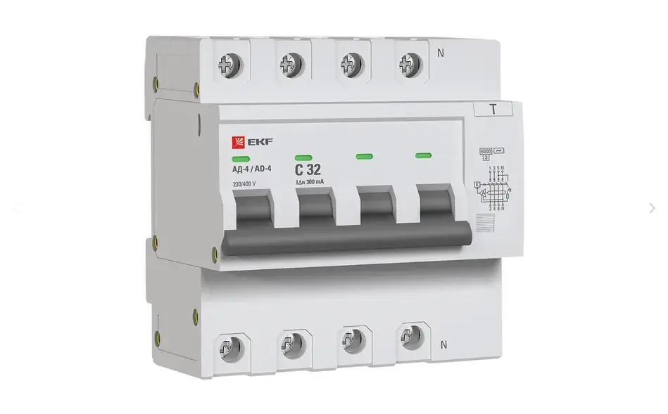 Выключатель автоматический дифференциальный (дифавтомат) АД-4 применяется в электрических цепях переменного тока номинального напряжения 400 В и частотой 50 Гц. Предназначен для защиты людей от поражения электрическим током при случайном прикосновении к открытым проводящим частям электроустановки. Защищает электроустановки (ЭО) при повреждении изоляции проводников и неисправностях ЭО, предотвращает возгорания и пожары, возникающие вследствие протекания токов утечки и развивающихся из них коротких замыканий, замыканий на корпус и замыканий на землю. Обеспечивает автоматическое отключение участка электрической сети при перегрузках и токах короткого замыкания.