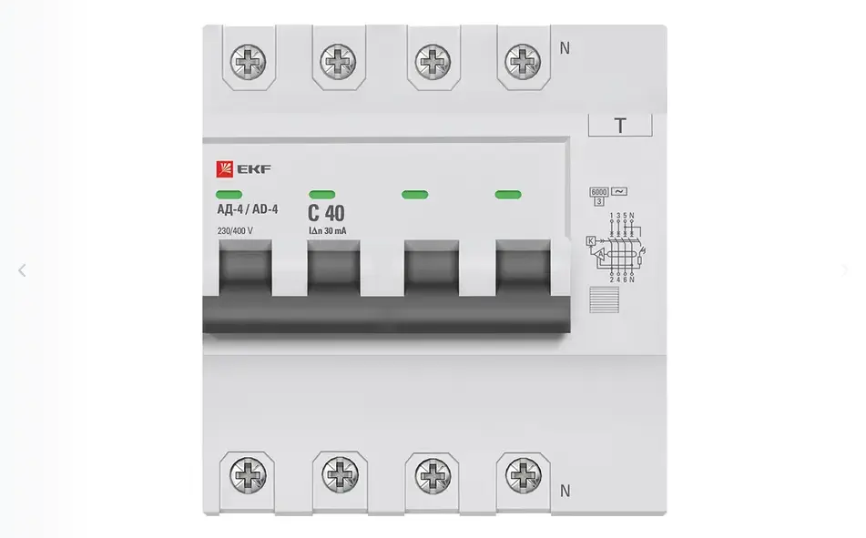 Дифференциальный автомат 4P 40 А / 30 мА (характеристика C, AC, электронный) 6 кА АД‑4 EKF PROxima — это надёжный защитный модуль, объединяющий УЗО и автоматический выключатель. Он быстро реагирует на повреждения цепи: утечку, перегрузку или короткое замыкание, отключая питание и предотвращая аварии.