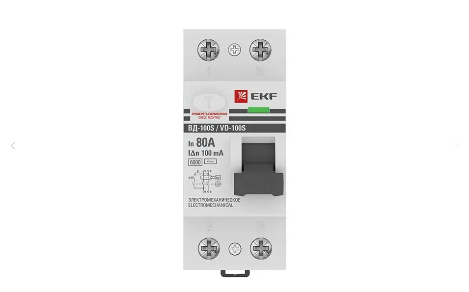 Устройство защитного отключения селективное ВД-100 2P 80А 100мА (тип АС, электромеханическое) 6кА EK