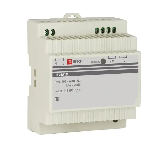 Блоки питания серии DR напряжениями 5/12/24/48 В, EKF устанавливаются на DIN рейку и предназначены для преобразования входного переменного напряжения 100-240 В в постоянное стабилизированное напряжение 5,12,24 или 48 Вольт.
