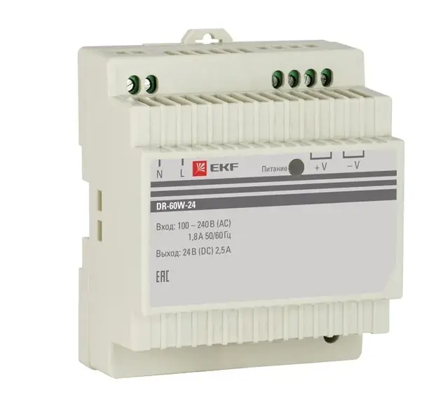 Блоки питания серии DR напряжениями 5/12/24/48 В, EKF устанавливаются на DIN рейку и предназначены для преобразования входного переменного напряжения 100-240 В в постоянное стабилизированное напряжение 5,12,24 или 48 Вольт.