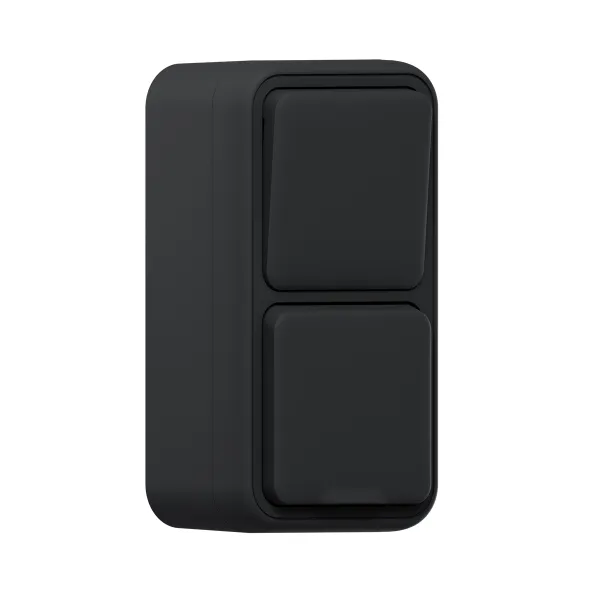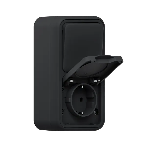 Блок из одноклавишного выключателя и розетки коллекции «Бронто» — надёжное решение для управления освещением в суровых условиях. Степень защиты IP55 защищает от пыли и воды, а материал корпуса устойчив к УФ-излучению и механическим повреждениям. Винтовые клеммы и герметичные мембранные вводы обеспечивают быстрый и надежный монтаж без лишних усилий — как для скрытой, так и для открытой установки.