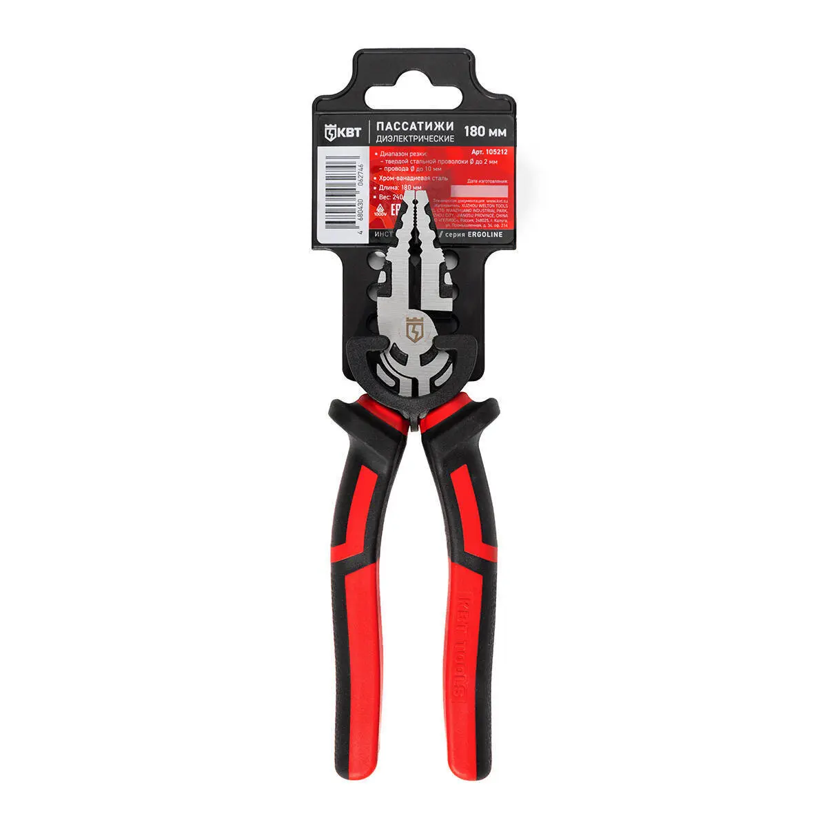 | 105212 | Пассатижи диэлектрические 180 мм серия ERGOLINE | хром-ванадиевая сталь | воронение + лакировка | многокомпонентные, с упорами для защиты от соскальзывания | резка стальной проволоки/резка проводов | Удержание круглых деталей/Дополнительно закаленные режущие кромки/Для работы под напряжением до 1000 В |