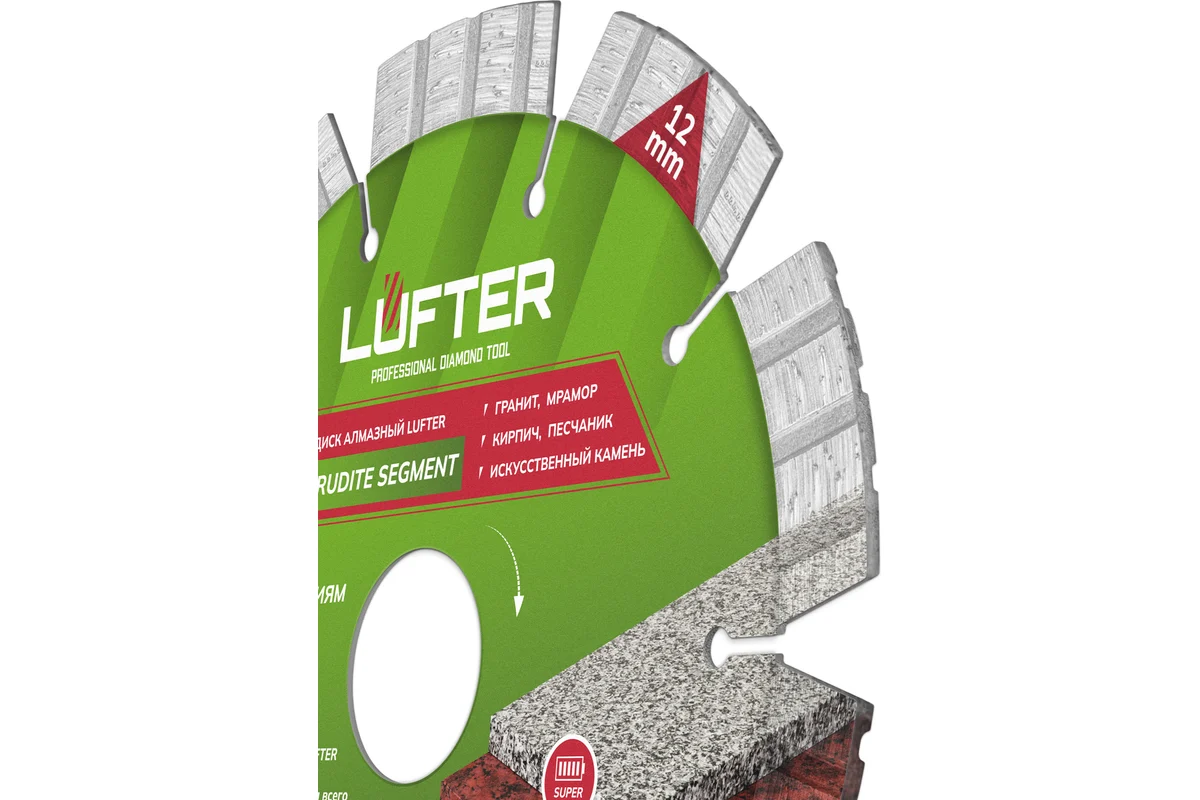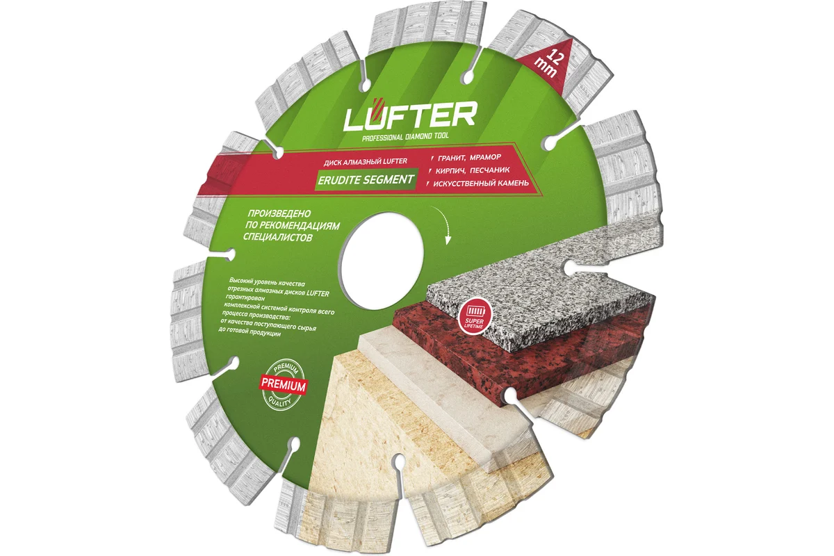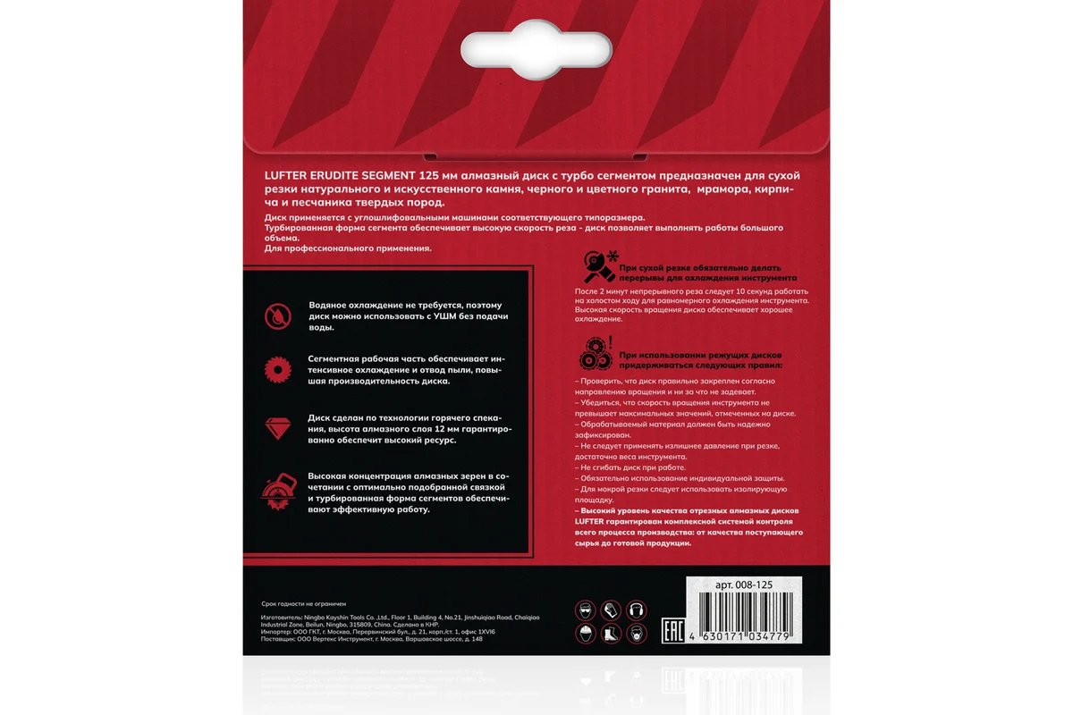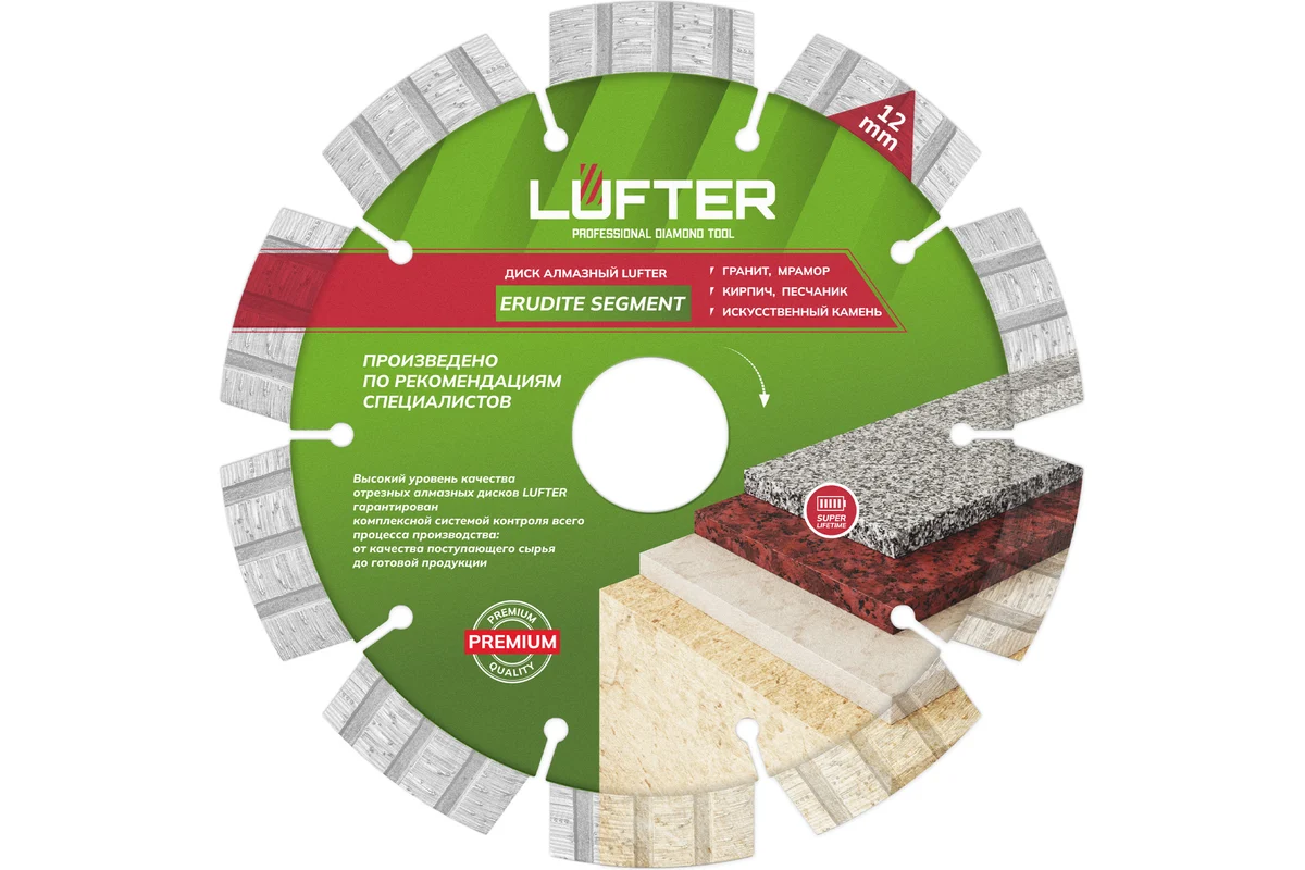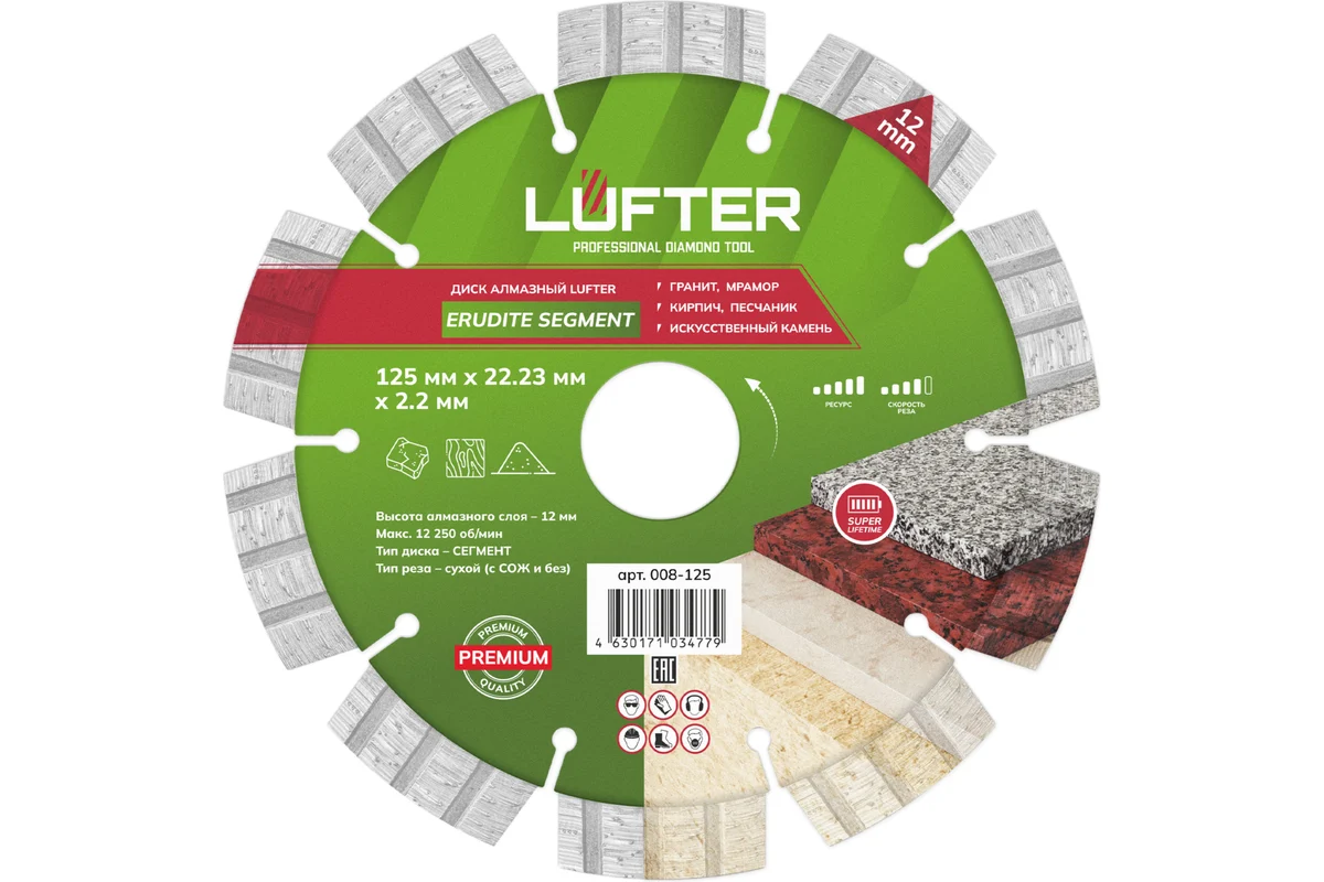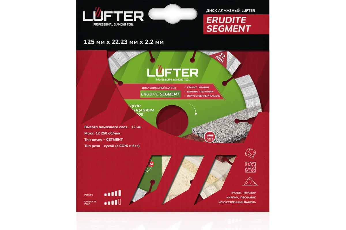 LUFTER ERUDITE SEGMENT 125 мм алмазный диск с турбо сегментом предназначен для сухой резки натурального и искусственного камня, черного и цветного гранита, мрамора, кирпича и песчаника твердых пород.