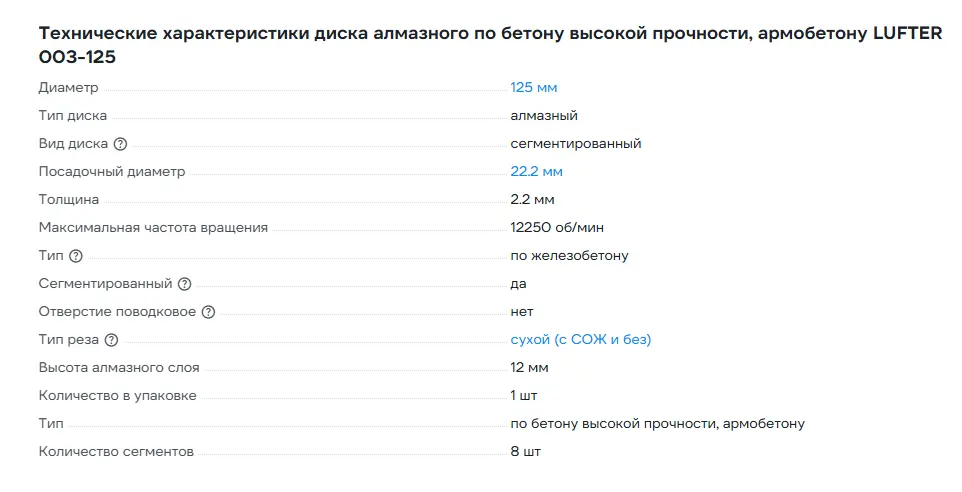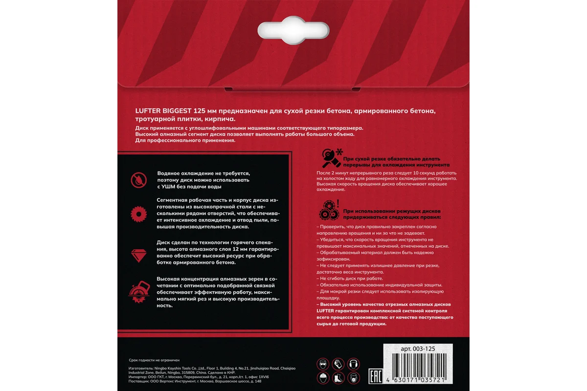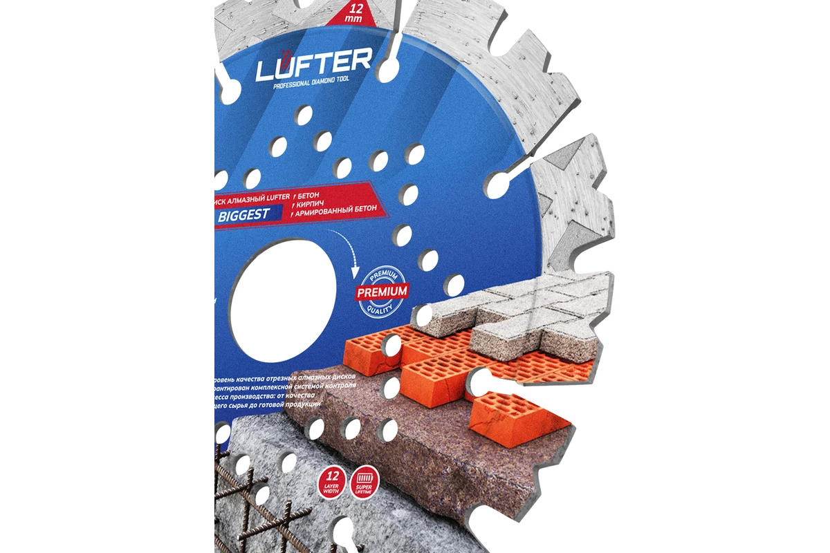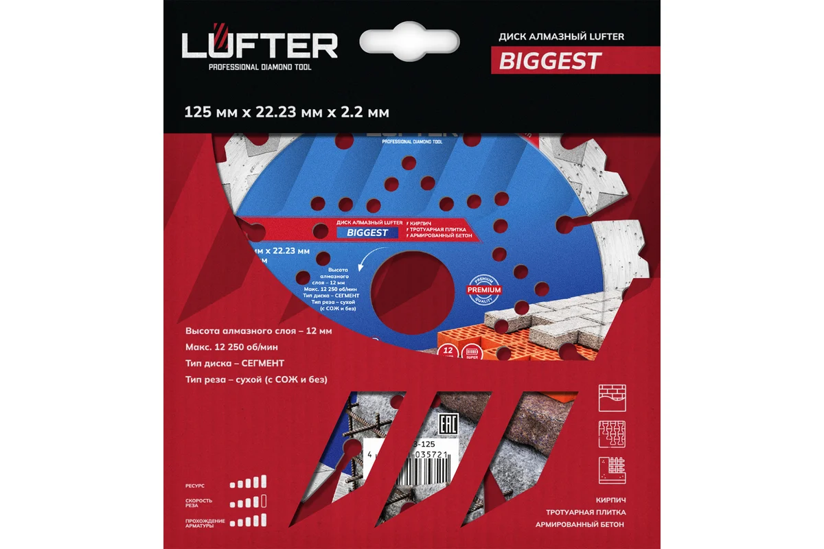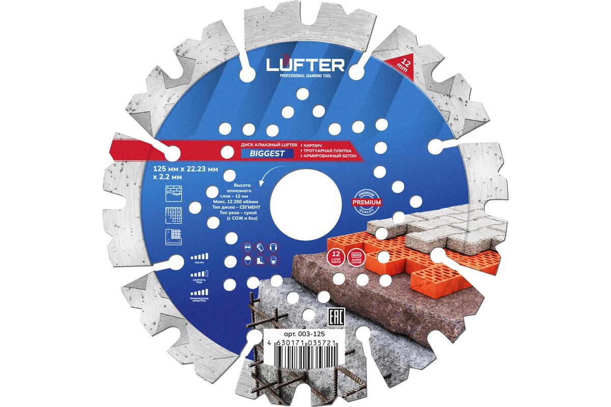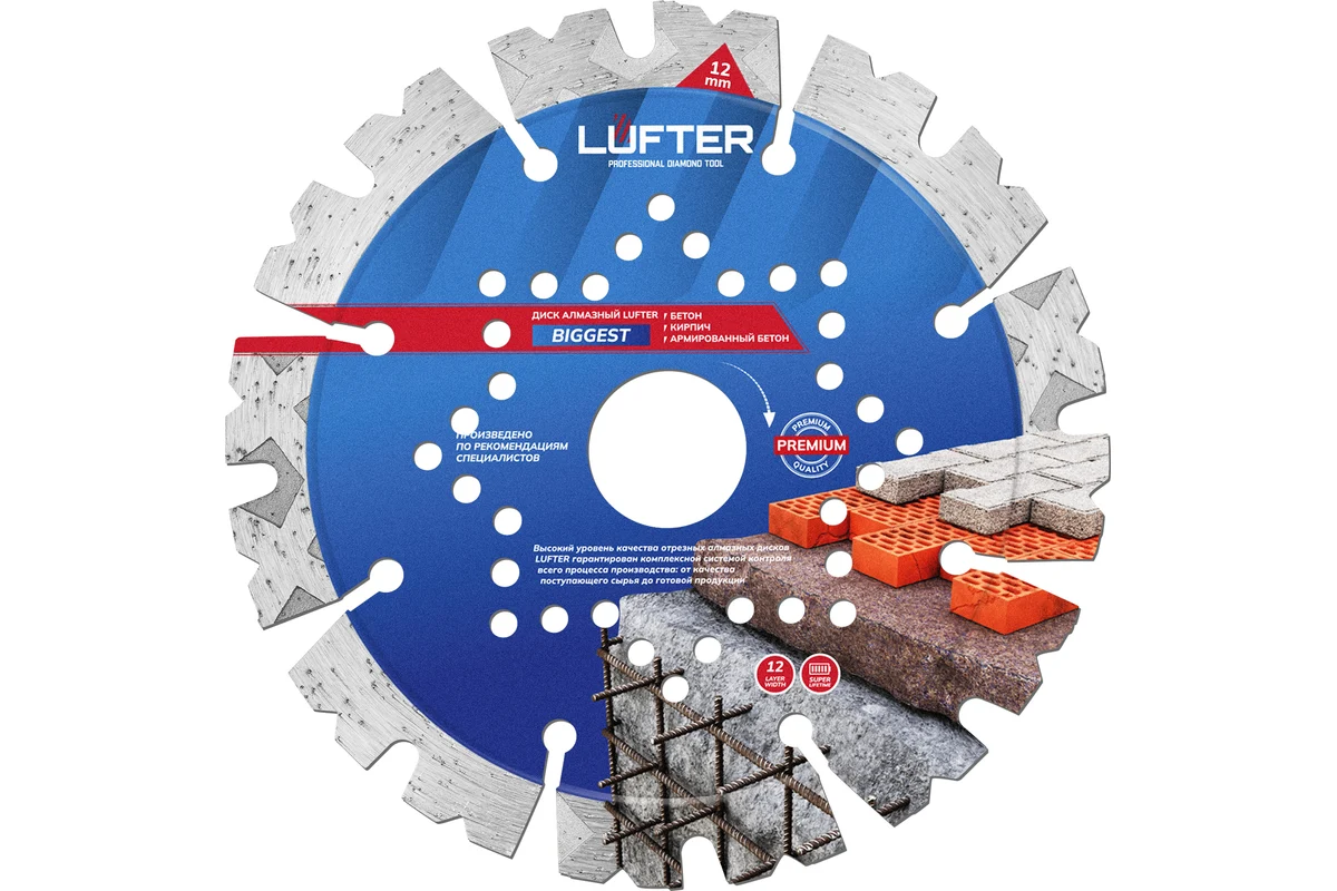 LUFTER BIGGEST 125 мм предназначен для сухой резки бетона, армированного бетона, тротуарной плитки, кирпича.