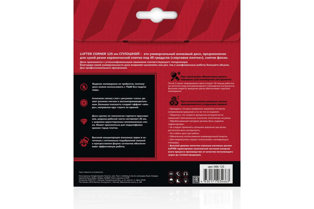 LUFTER CORNER 125 мм СПЛОШНОЙ - это универсальный алмазный диск, предназначен для сухой резки керамической плитки под 45 градусов ("заусовка плитки"), снятия фаски.