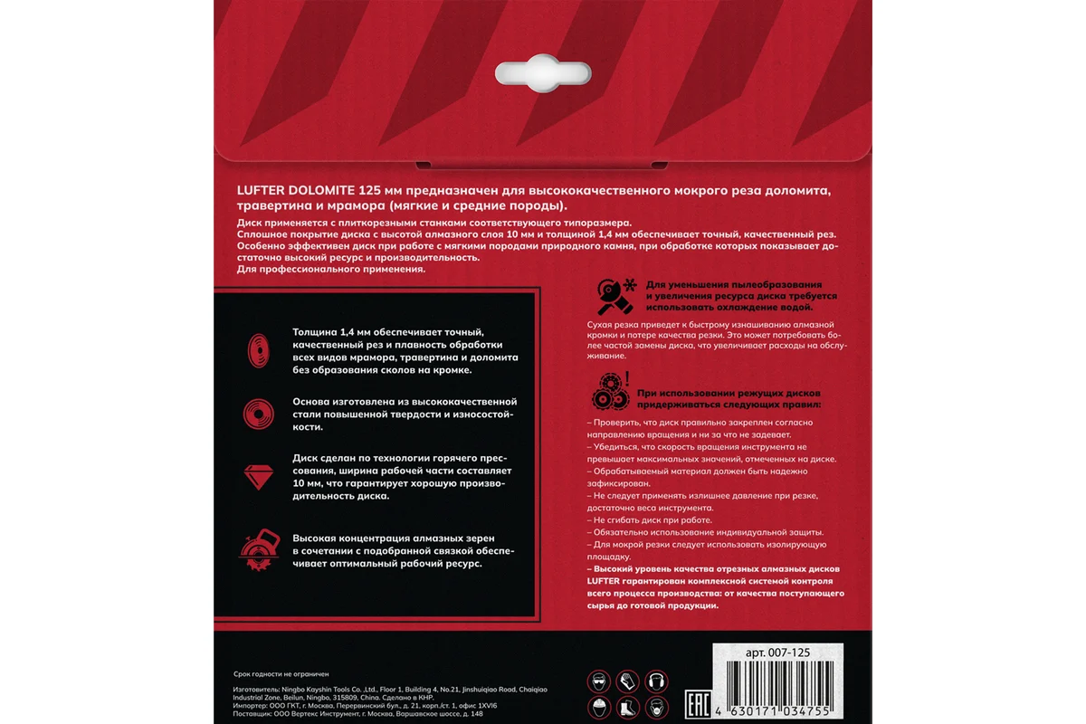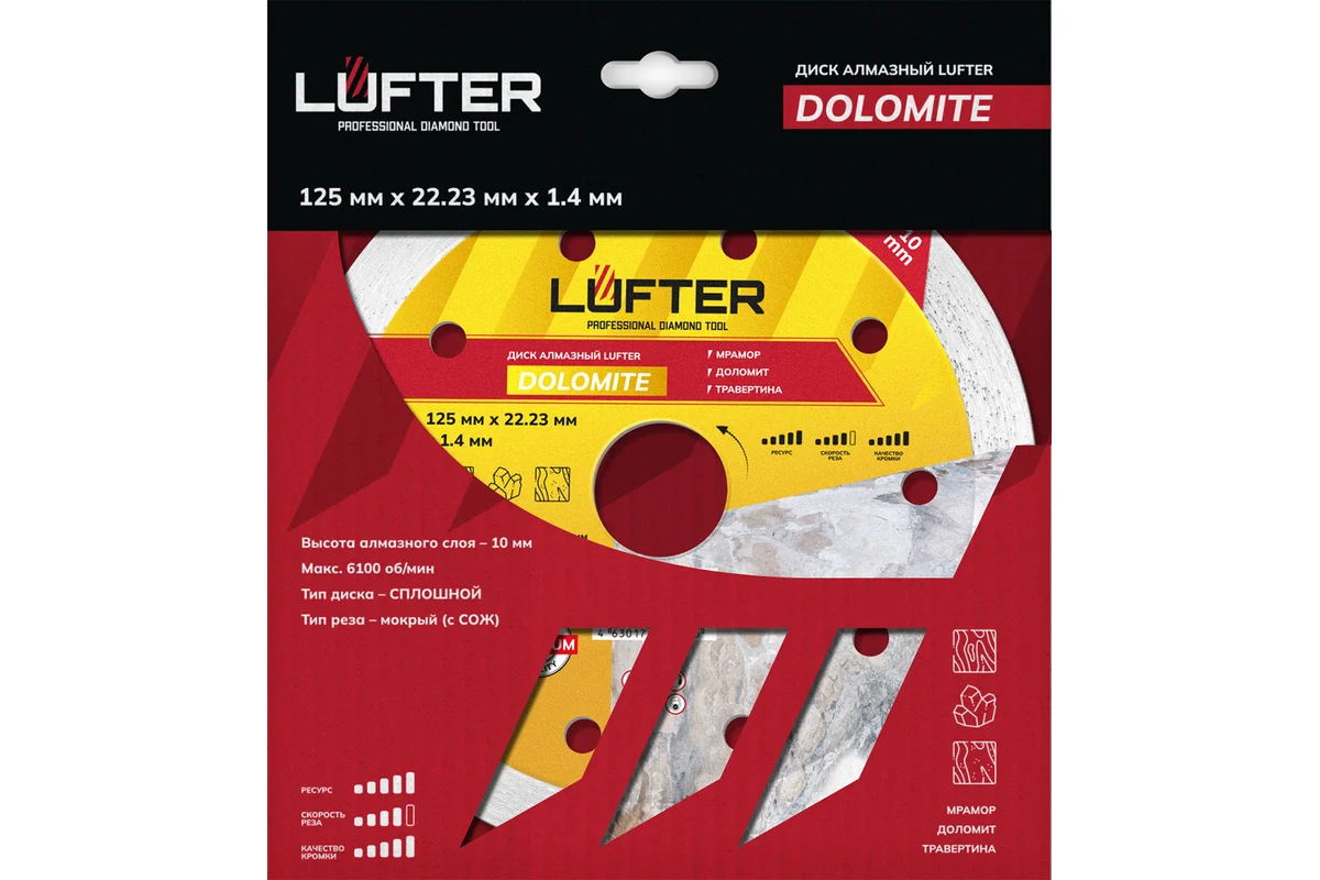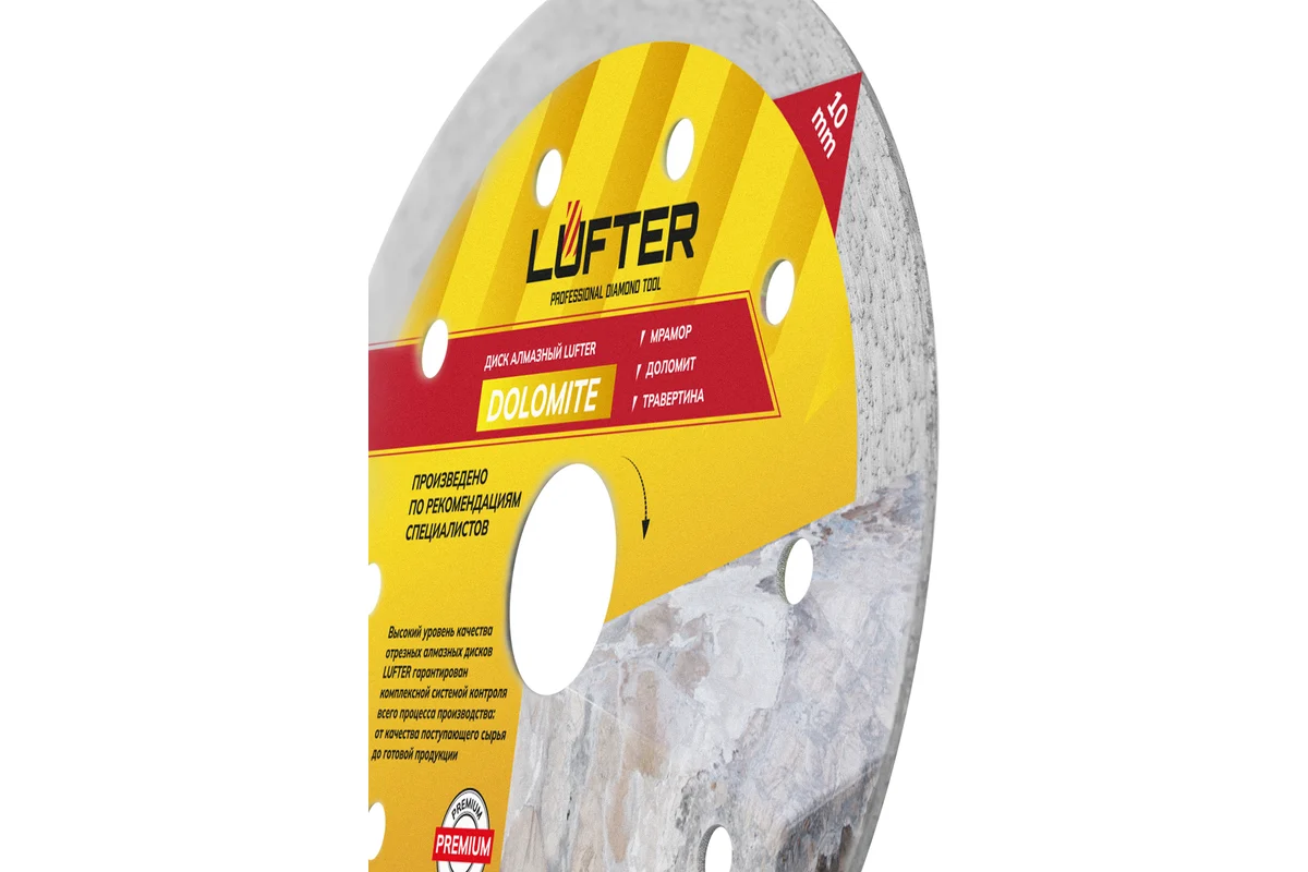 LUFTER DOLOMITE 125 мм предназначен для высококачественного мокрого реза доломита, травертина и мрамора (мягкие и средние породы).
