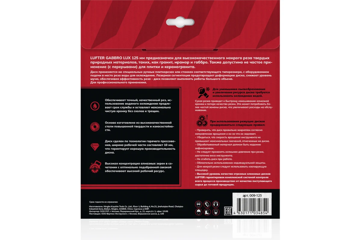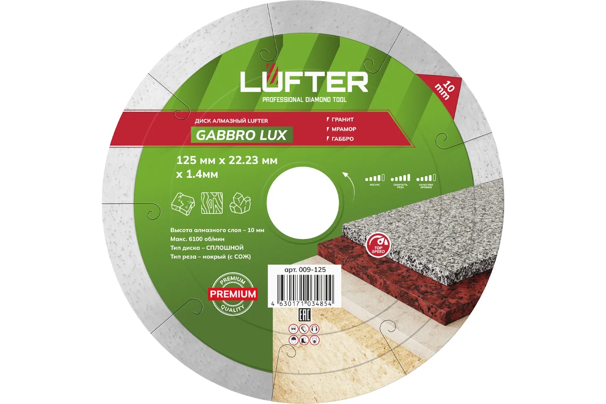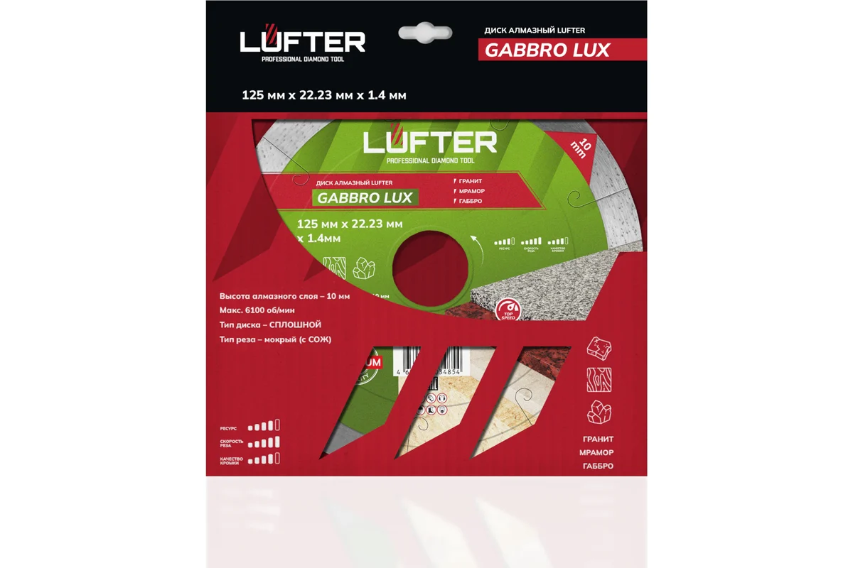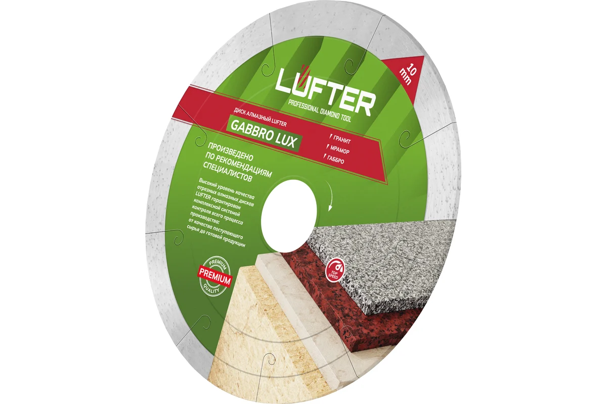 LUFTER GABBRO LUX 125 мм предназначен для высококачественного мокрого реза твердых природных материалов, таких, как гранит, мрамор и габбро. Также допустимо не частое применение (с перерывами) для плитки и керамогранита.
