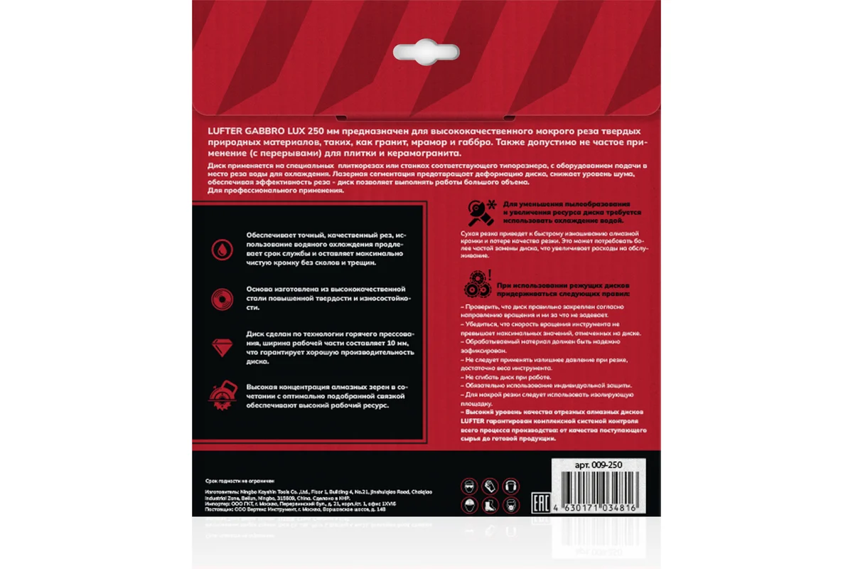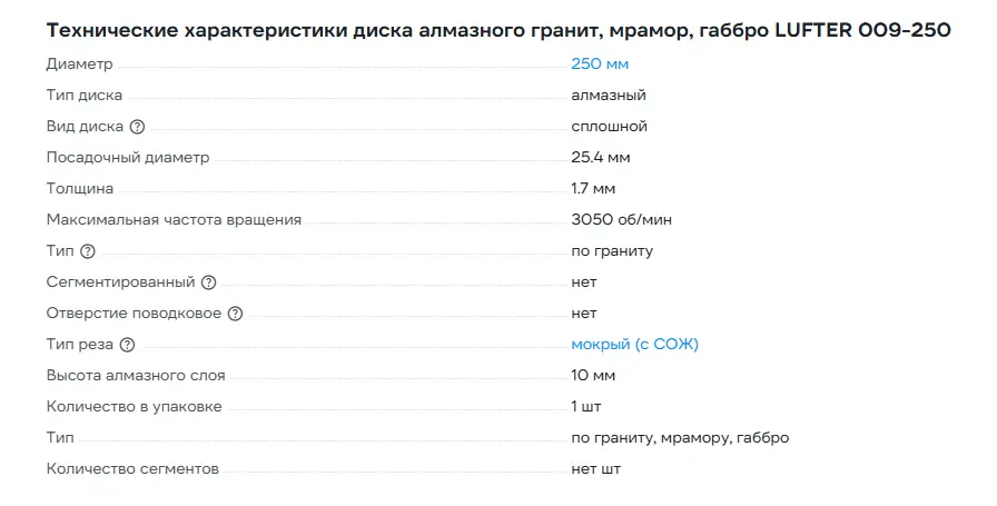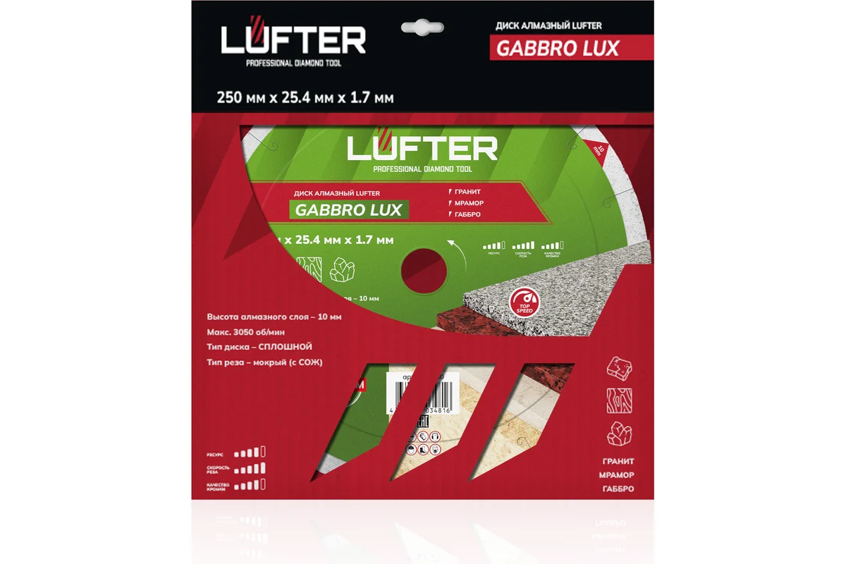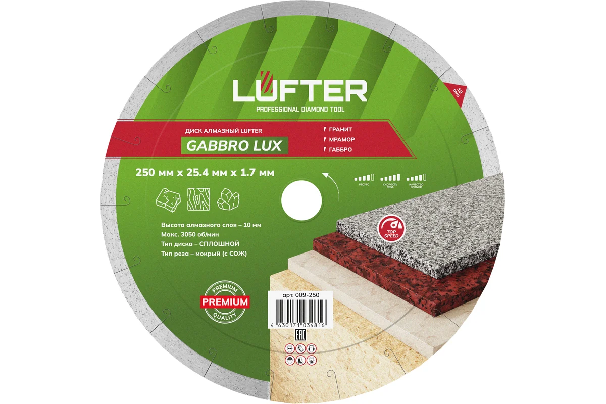 LUFTER GABBRO LUX 250 мм предназначен для высококачественного мокрого реза твердых природных материалов, таких, как гранит, мрамор и габбро. Также допустимо не частое применение (с перерывами) для плитки и керамогранита.