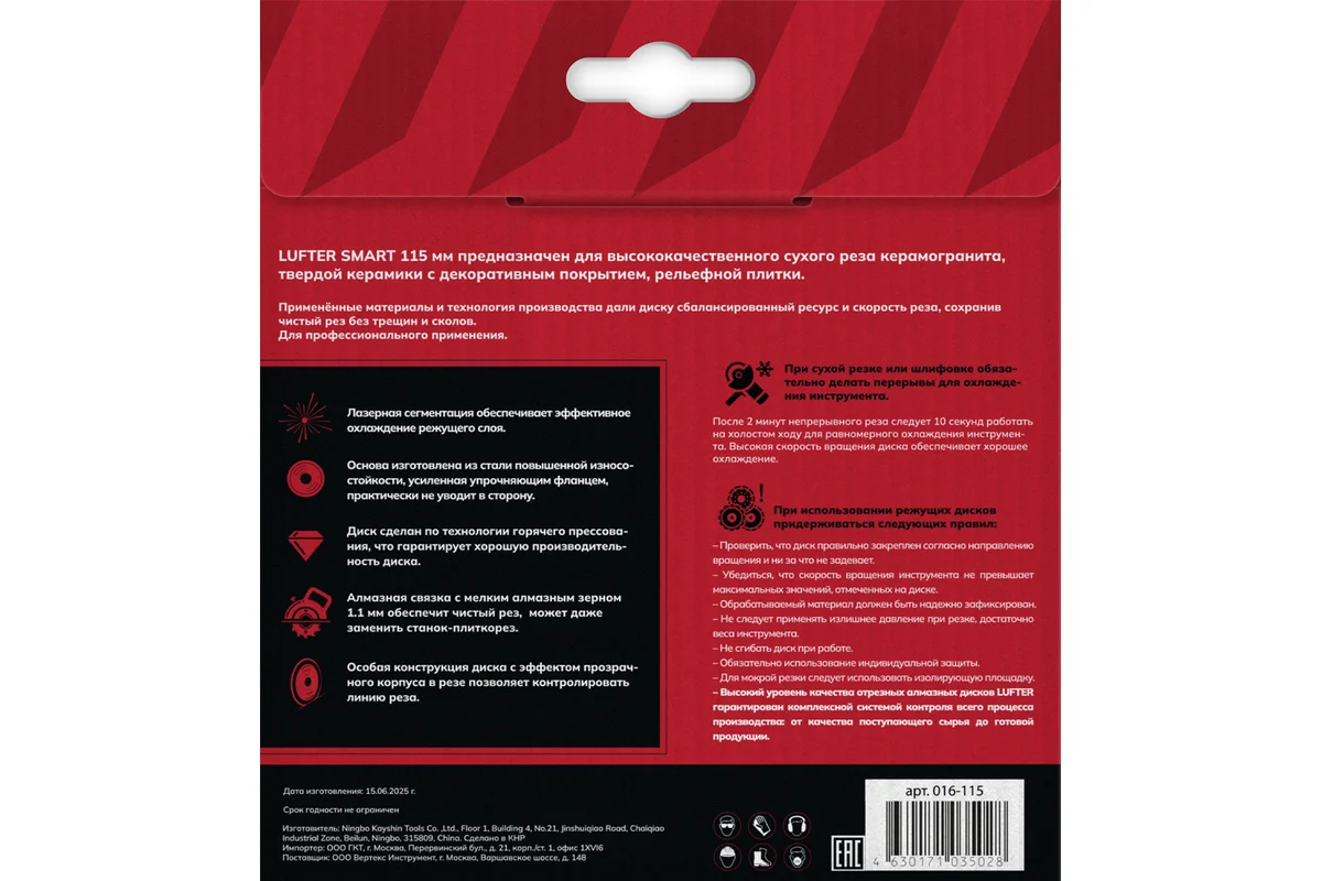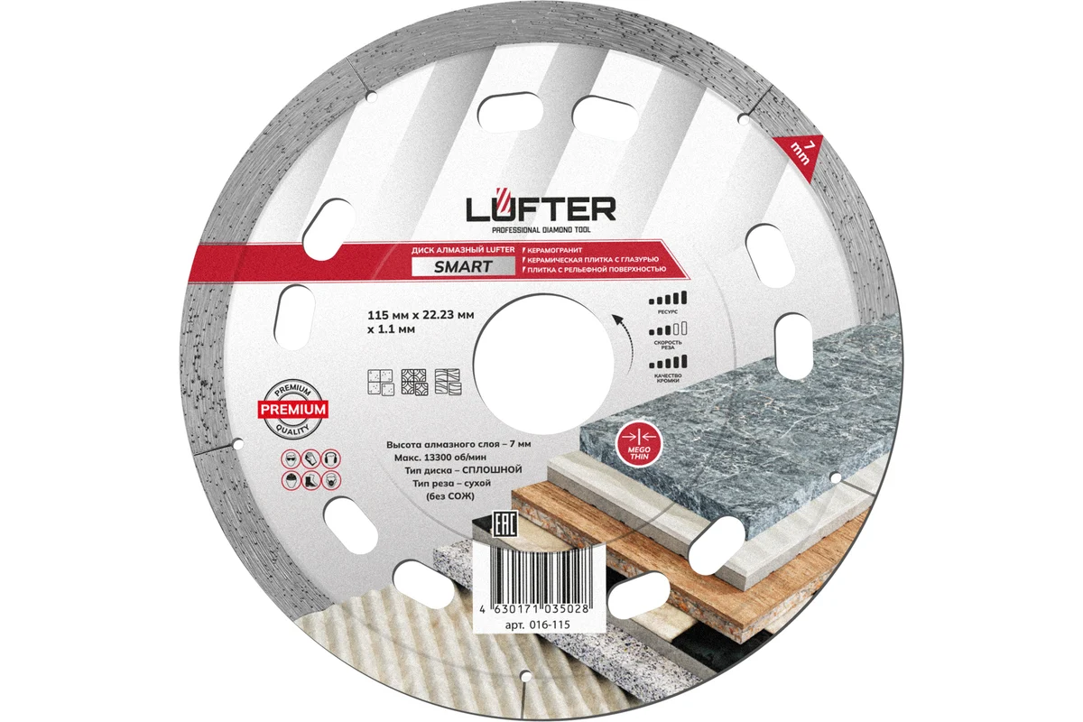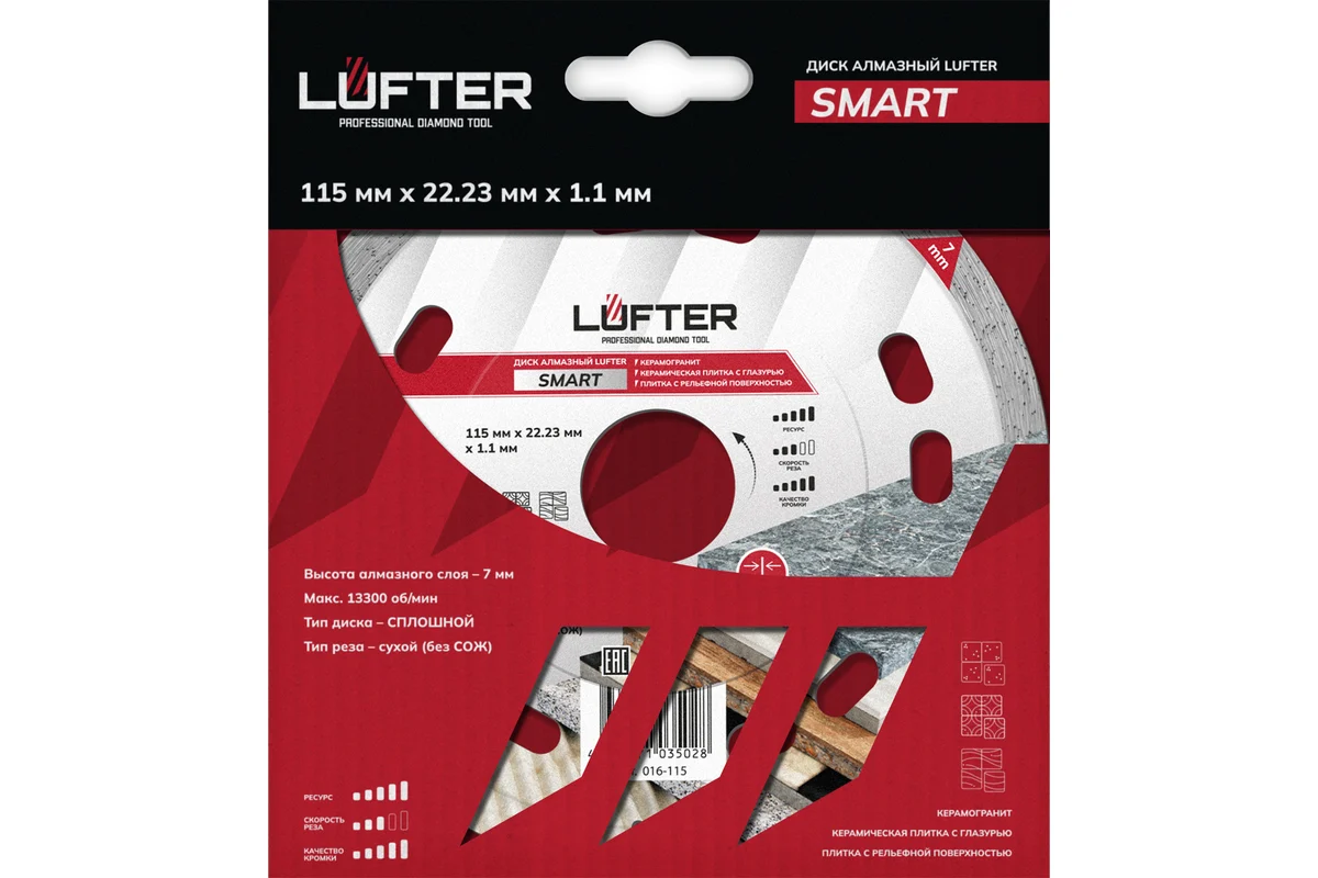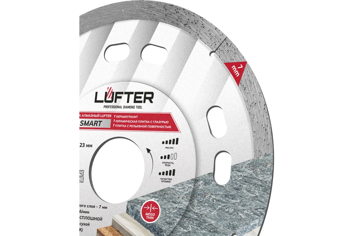LUFTER SMART 115 мм предназначен для высококачественного сухого реза керамогранита, твердой керамики с декоративным покрытием, рельефной плитки.