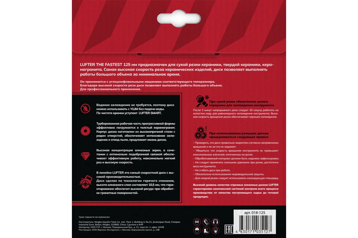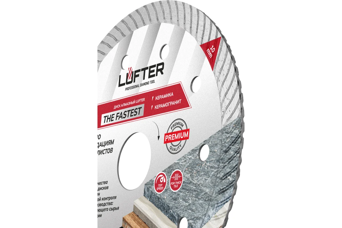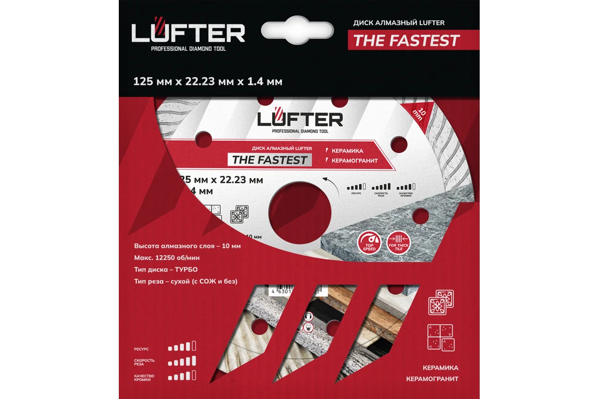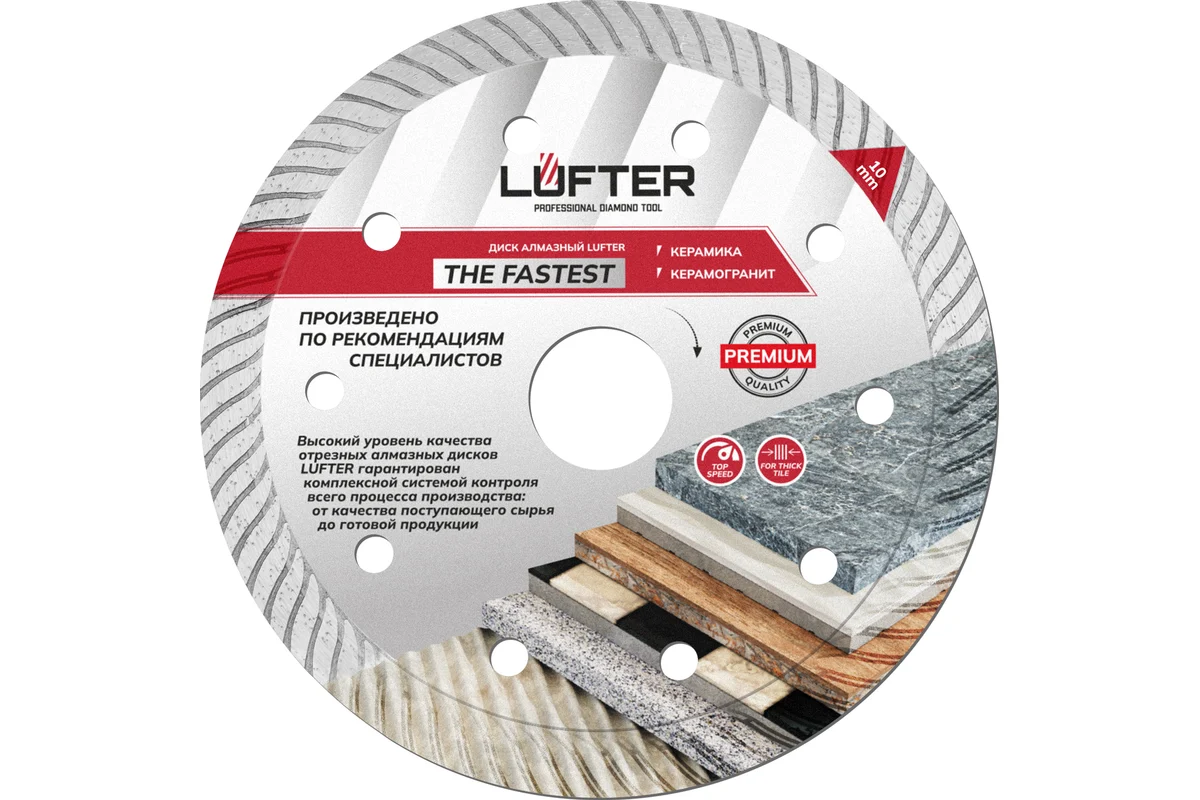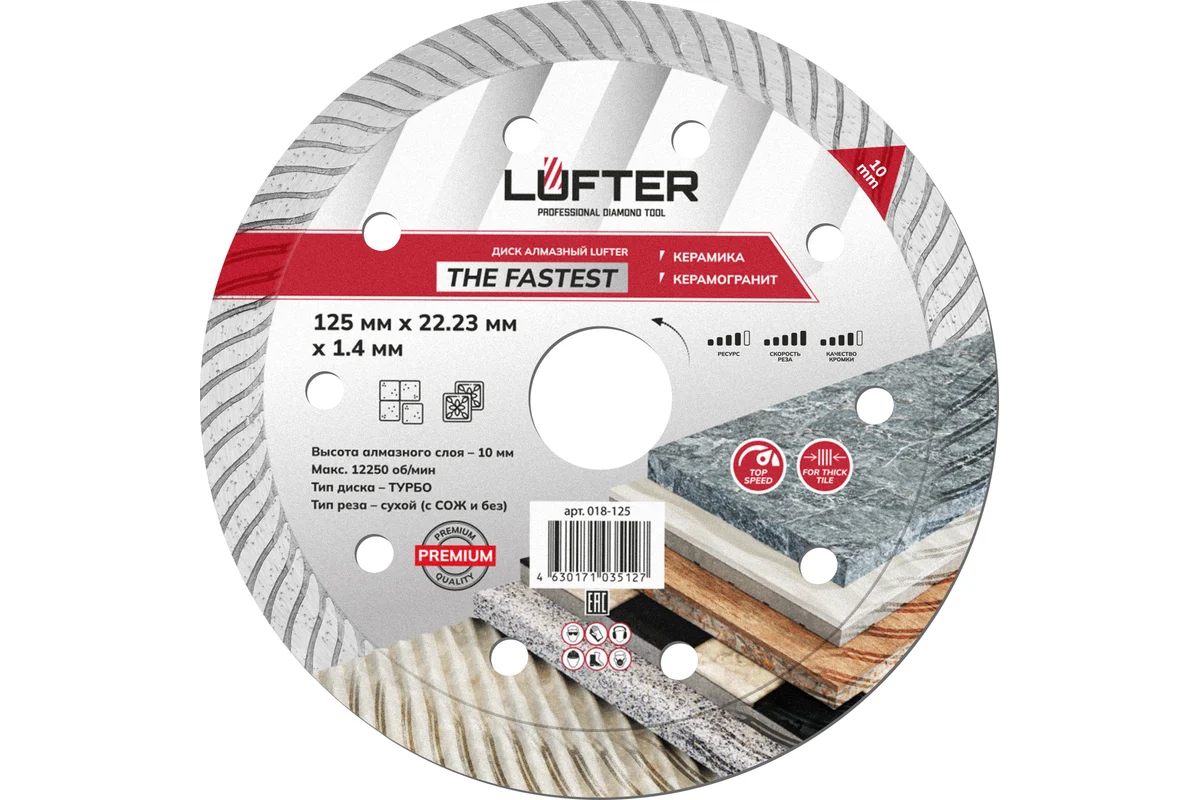 LUFTER THE FASTEST 125 мм предназначен для сухой резки керамики, твердой керамики, керамогранита. Самая высокая скорость реза керамических изделий, диск позволяет выполнять работы большого объема за минимальное время.