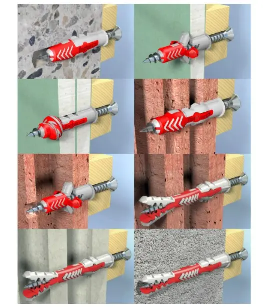 Сочетание 2-х различных материалов и нескольких типов функционирования (распор, складывание, закручивание) в зависимости от материала основания обеспечивает оптимальную жесткость дюбеля, способствуя таким образом достижению высоких нагрузок и открывает широкий спектр применения.