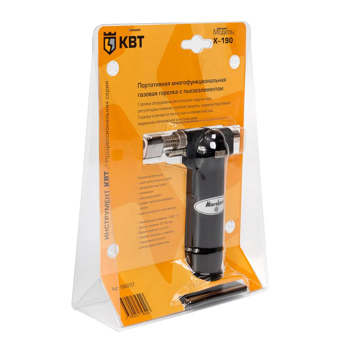 Газовая горелка имеет длину пламени от 30 до 60 мм; время горения:110 минут; диаметр корпуса баллона; 38 мм. |