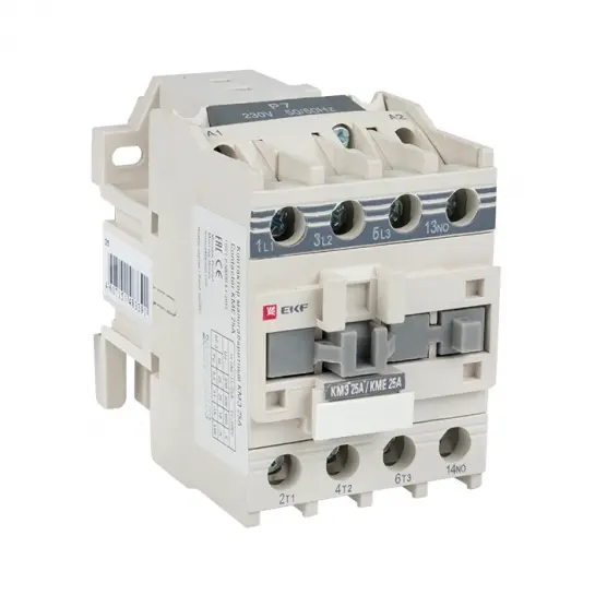 Контакторы КМЭ EKF PROxima состоят из корпуса, закрепленных в нем неподвижных контактов, подвижных контактов, которые закреплены в подвижной части магнитной системы. Неподвижная часть магнитной системы закреплена жестко в корпусе КМЭ. Пружина препятствует смыканию контактов. При подаче напряжения на катушку управления в магнитной системе контактора возникает магнитное поле, которое, преодолевая сопротивление пружины, смыкает магнитную систему и замыкает контакты. При отключении напряжения с катушки управления пружина размыкает контакты. Возможна коммутация алюминиевыми медным проводом.