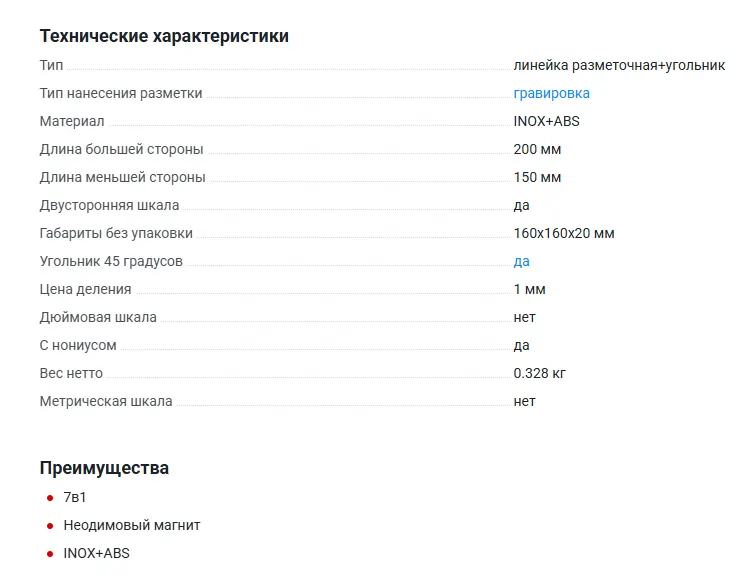Изготовлена линейка из нержавеющей стали 300х25 мм, толщиной 1,7 мм. Нанесена двусторонняя гравированная шкала. Упор выполнен из ABS пластика с углами 90°, 45°с нанесенной шкалой 180°. Крепление с помощью винта или неодимового магнита.