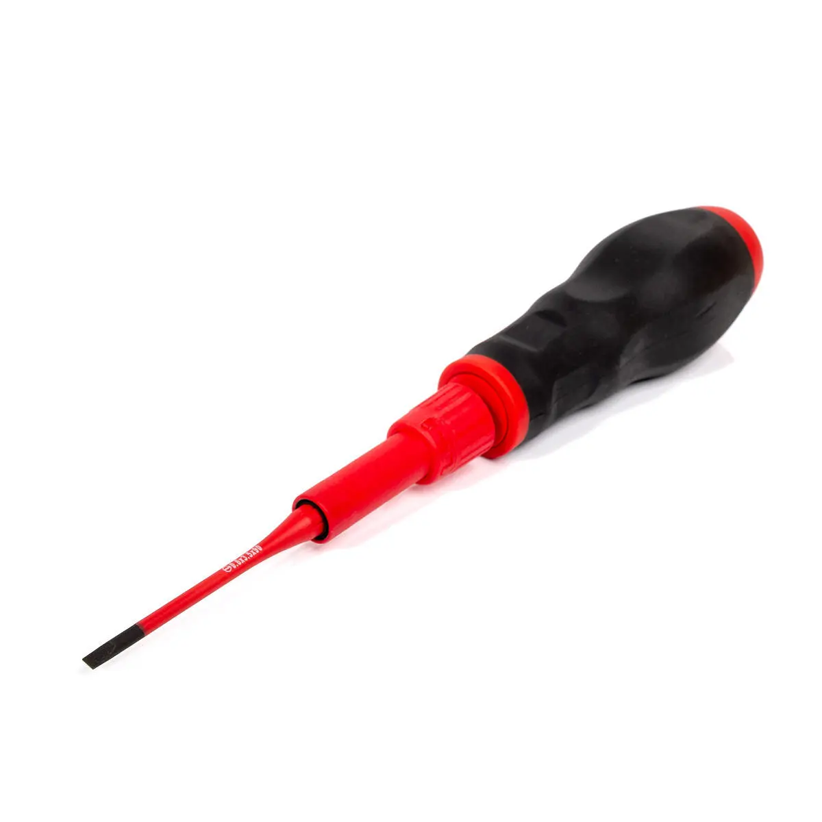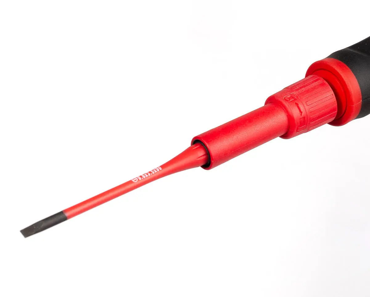 для работ под напряжением до 1000В/ намагниченные наконечники бит/ отверстие для подвешивания/ маркировка типоразмера на каждой бите/ механизм фиксации биты в рукоятке/ усилие крутящего момента 1-6 Нм/ монтаж винтов с глубокой посадкой |