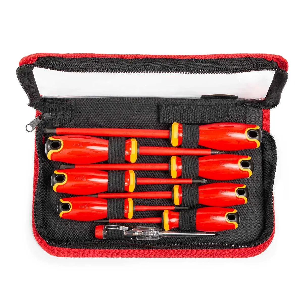 для работ под напряжением до 1000В/ рукоятка с защитой от скатывания/ маркировка профиля на торце рукоятки/ отверстие для подвешивания/ намагниченные наконечники/ многокомпонентная нескользящая рукоятка |