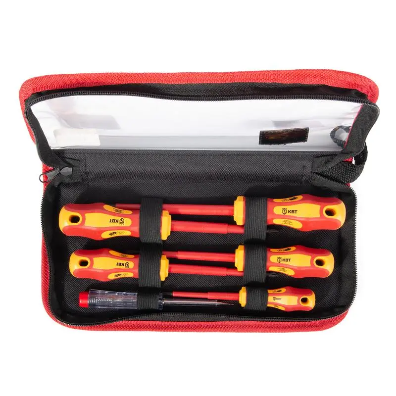 для работ под напряжением до 1000В/ намагниченные наконечники/ двухкомпонентная нескользящая рукоятка/ рукоятка с защитой от скатывания/ маркировка профиля на торце рукоятки/ индикаторная отверка в комплекте |