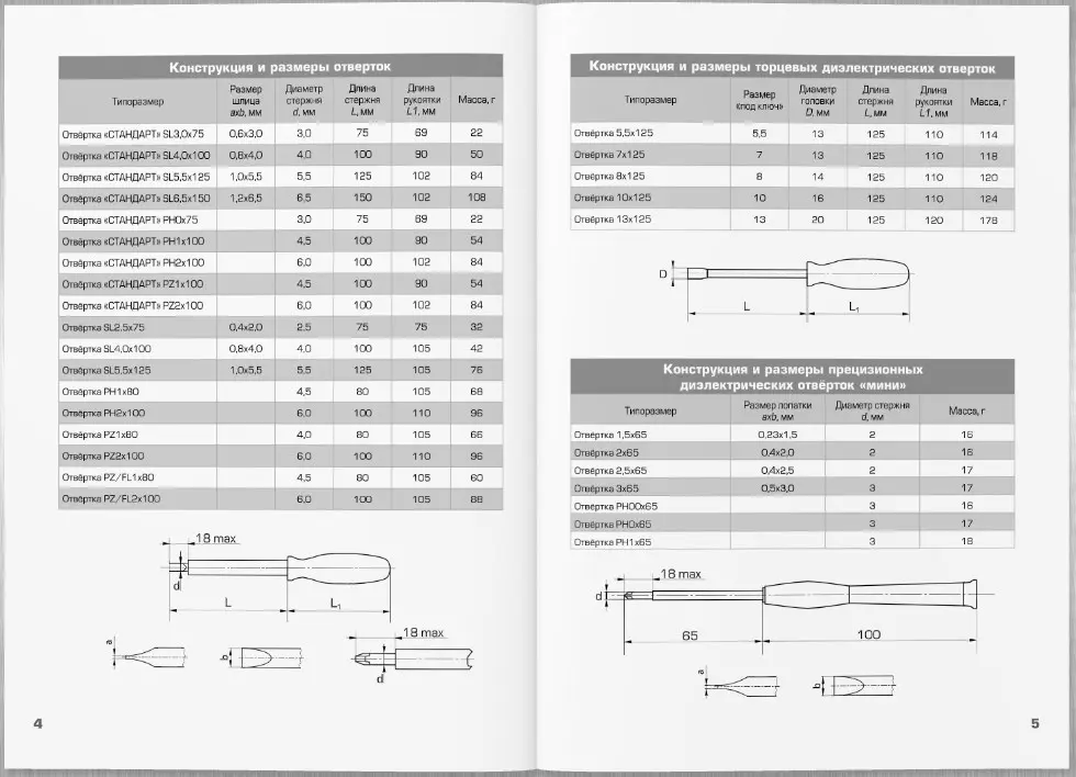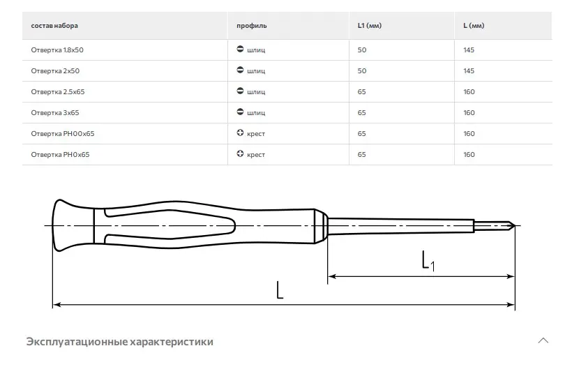 Наименование Профиль L (мм) L1 (мм) A (мм) B (мм) Отвертка 1.8х50 шлиц 50 145 1.5 0.23 Отвертка 2х50 шлиц 50 145 2 0.4 Отвертка 2.5х65 шлиц 65 160 2.5 0.4 Отвертка 3х65 шлиц 65 160 3 0.5 Отвертка PH00х65 крест 65 160 2 - Отвертка PH0х65 крест 65 160 2.5 -