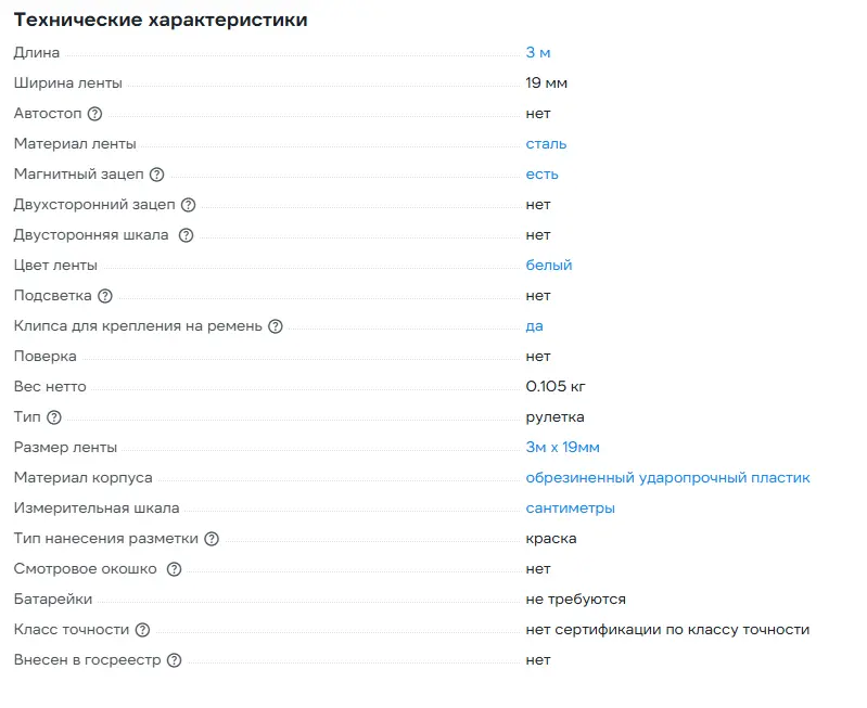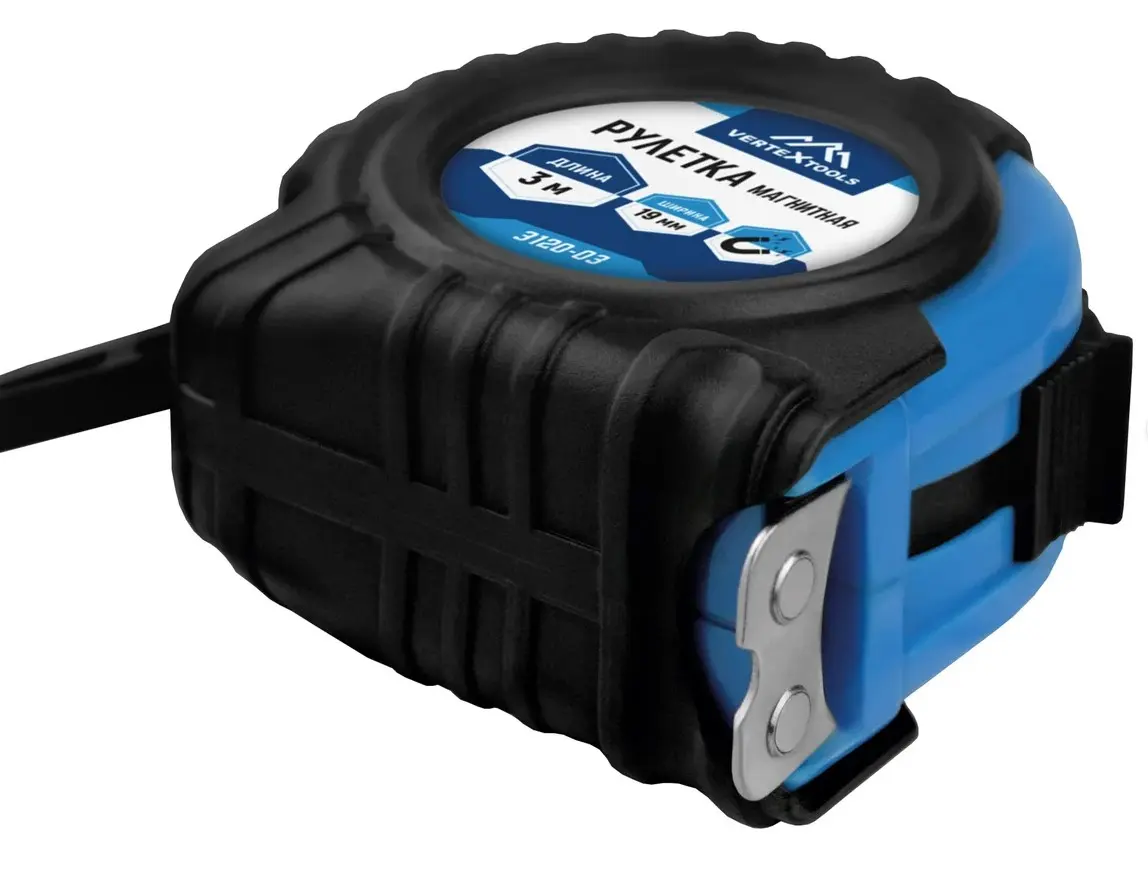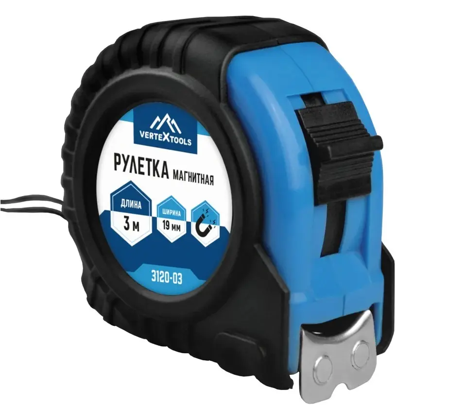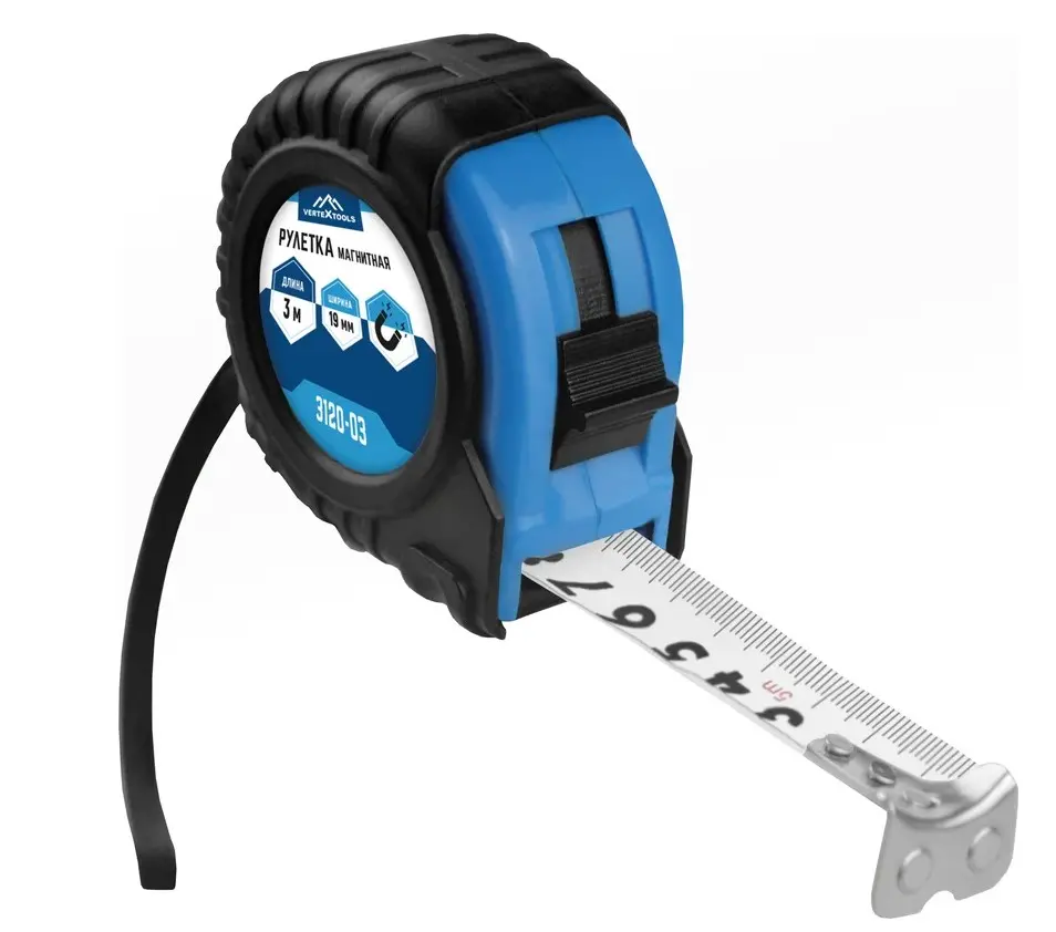 Рулетка vertextools магнитная 3х19 мм 3120-03 применяется для проведения измерений при строительных и монтажных работах. При изготовлении корпуса рулетки применена ударопрочная пластмасса, корпус частично обрезинен. Устройство и обводы корпуса рулетки имеют эргономичную направленность. Механизм фиксации надёжно останавливает мерную ленту. Измерительная лента имеет полимерное покрытие, стойкое к абразивному воздействию. Основание ленты оснащено магнитным зацепом.