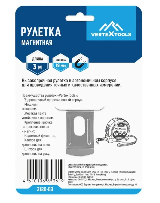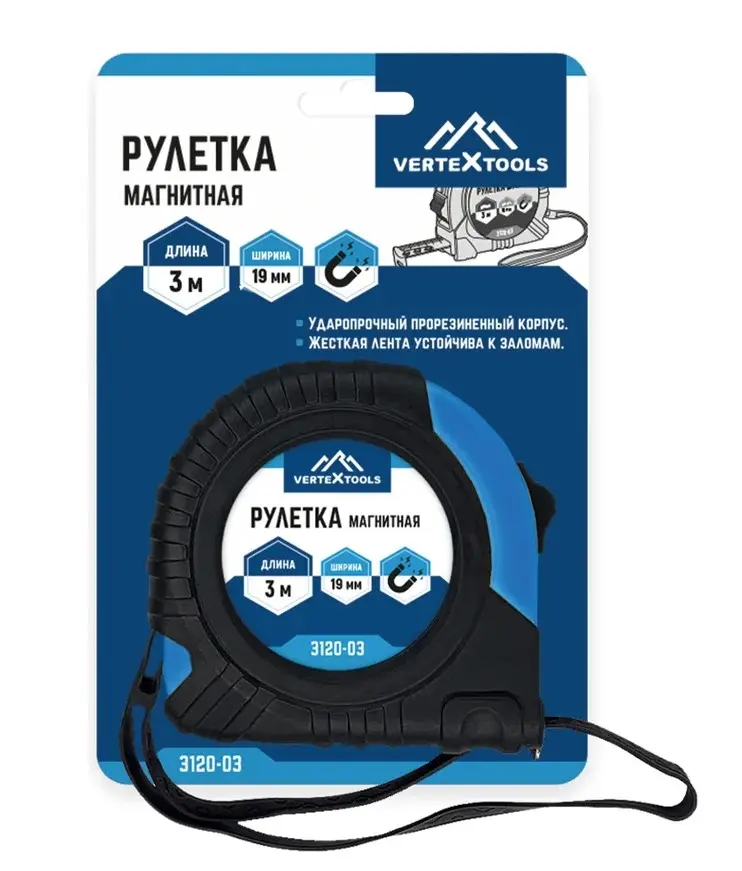 Рулетка vertextools магнитная 3х19 мм 3120-03