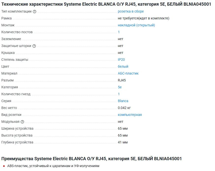 Розетка Systeme Electric(ранееSchneider Electric) BLANCA (белый, открытой установки) компьютерная RJ45 категория 5е с изолирующей пластиной.