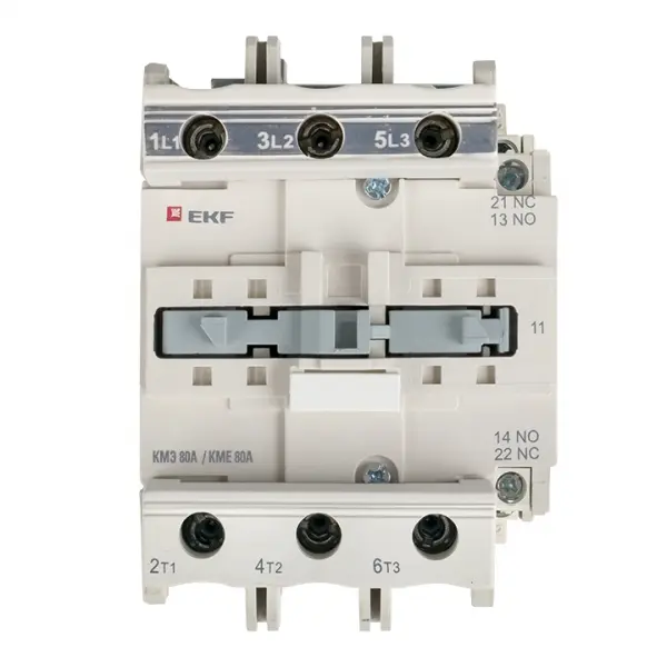 Контакторы КМЭ EKF PROxima состоят из корпуса, закрепленных в нем неподвижных контактов, подвижных контактов, которые закреплены в подвижной части магнитной системы. Неподвижная часть магнитной системы закреплена жестко в корпусе КМЭ. Пружина препятствует смыканию контактов. При подаче напряжения на катушку управления в магнитной системе контактора возникает магнитное поле, которое, преодолевая сопротивление пружины, смыкает магнитную систему и замыкает контакты. При отключении напряжения с катушки управления пружина размыкает контакты. Возможна коммутация алюминиевыми медным проводом.