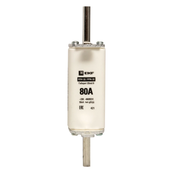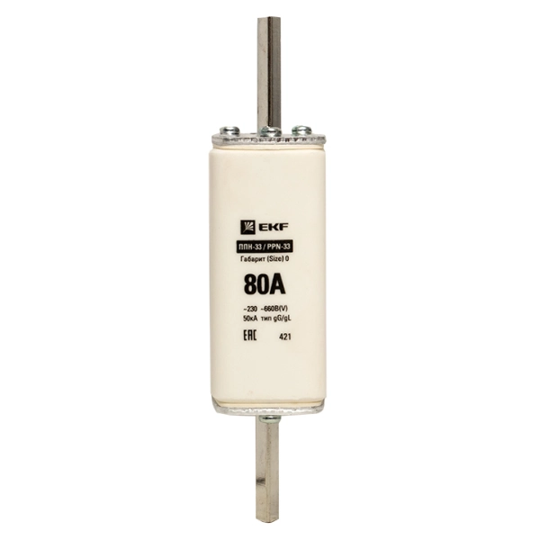 Плавкая вставка ППН-33 160/ 80А габарит 0 EKF. Предохранители плавкие ППН EKF, укомплектованные плавкими вставками типа gG/gL, предназначаются для защиты кабельных линий и промышленных электроустановок от токов перегрузки и короткого замыкания. Предохранители применяются в электрических сетях переменного тока частотой 50 Гц с напряжением до 660В. Применяются для крепления в распределительных и вводно-распределительных устройствах. Предохранители плавкие ППН могут устанавливаться в основание с держателем, а также в специально предназначенные рубильники. В комплект поставки предохранителей плавких ППН основание с держателем не входит и приобретается отдельно.