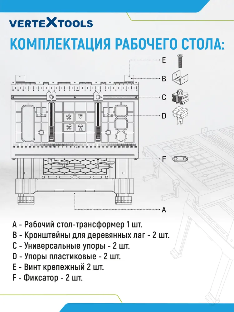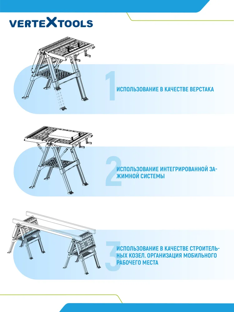 ВЕРСТАК СКЛАДНОЙ VERTEXTOOLS PROFI это универсальное приспособление для домашней мастерской. Может использоваться в качестве верстака, так и строительных козел.