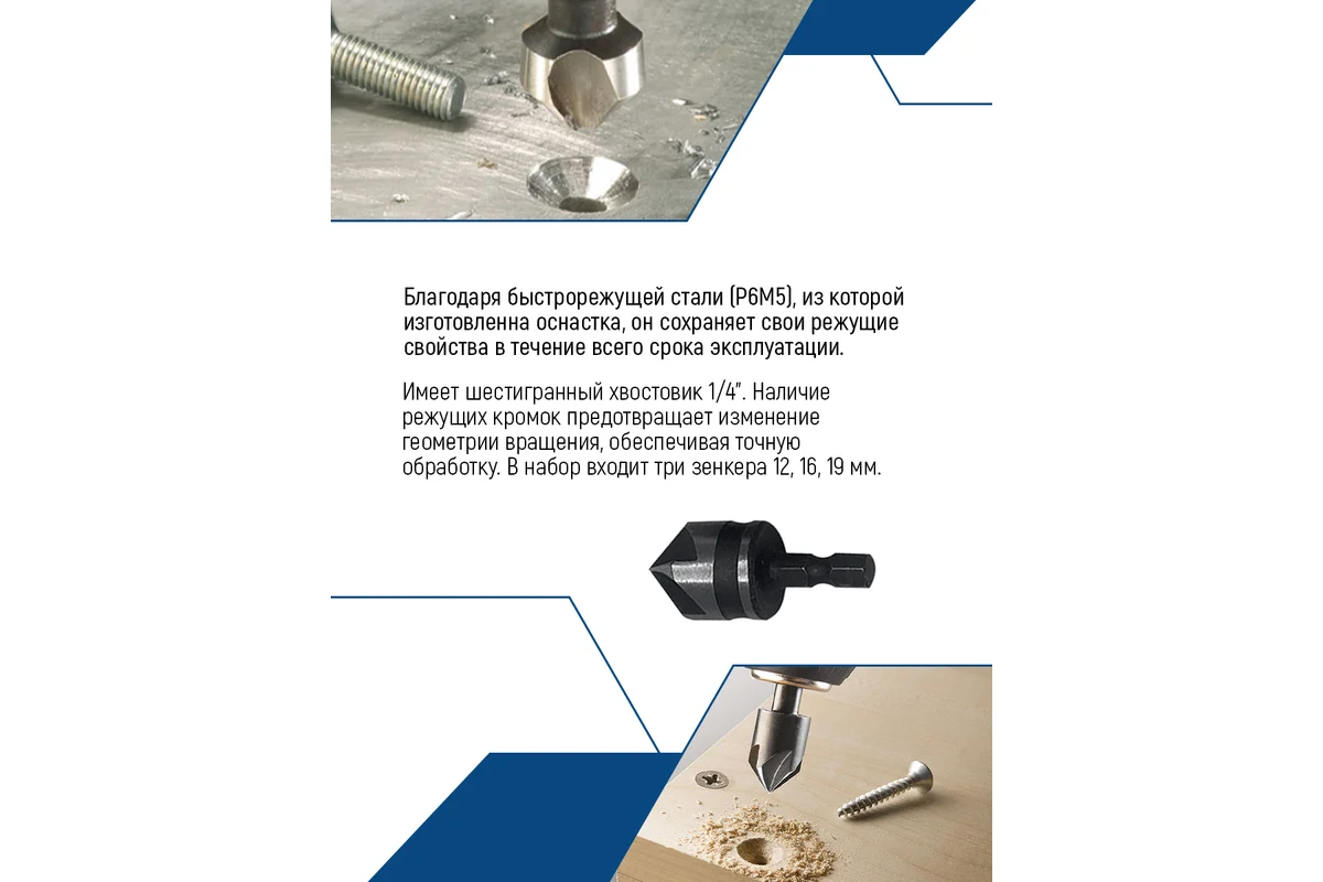 Имеет шестигранный хвостовик 1/4". Благодаря быстрорежущей стали (P6M5), из которой изготовлена оснастка, она сохраняет свои режущие свойства в течение всего срока эксплуатации. Наличие режущих кромок предотвращает изменение геометрии вращения, обеспечивая точную обработку.