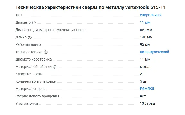 Сверло по металлу vertextools 515-11 предназначено для дрелей. Используется для сверления отверстий в металле.