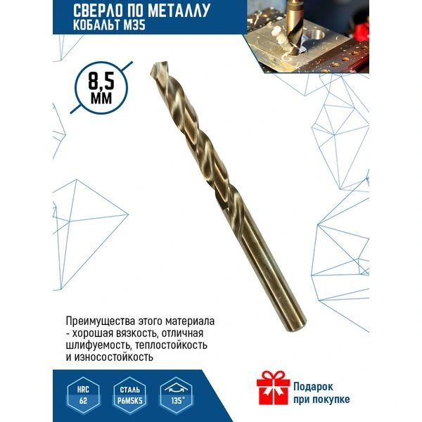 Сверло по металлу кобальт М35 Vertextools изготовлено из стали Р6М5К5 методом вышлифования профиля, твёрдость стали 62HRC. Кобальт, входящий в состав стали в количестве 5%, позволяет сохранять твёрдость при высоких температурах, возникающих при сверлении жёстких пластмасс, чугуна, легированных и нержавеющих сталей.