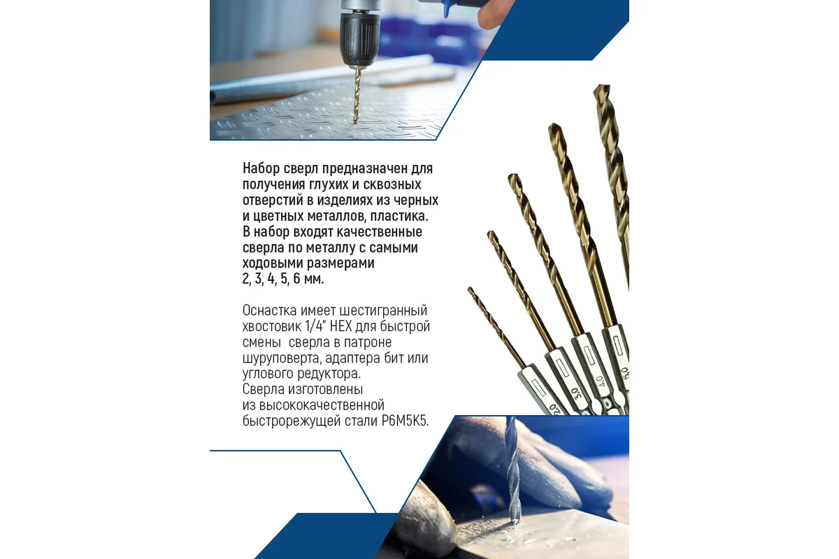 Набор сверл предназначен для получения глухих и сквозных отверстий в изделиях из черных и цветных металлов, пластика. В набор входят качественные сверла по металлу с самыми ходовыми размерами 2, 3, 4, 5, 6мм.