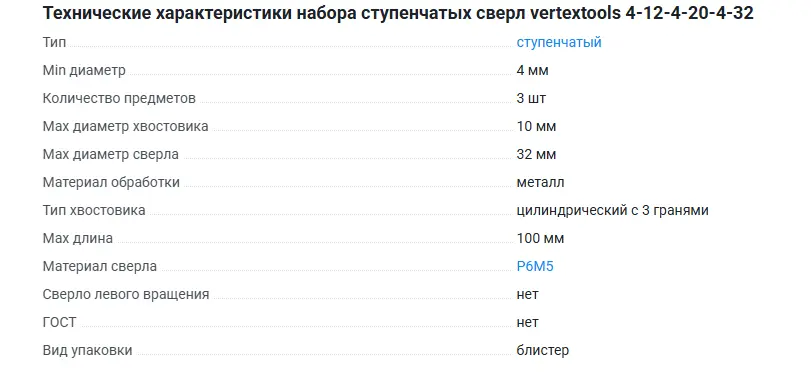 Набор ступенчатых сверл 4-12 мм, 4-20 мм, 4-32 мм vertextools 4-12-4-20-4-32 предназначен для получения отверстий различного диаметра без перестановки режущего инструмента в изделиях из цветных металлов, пластика и стальных листах.