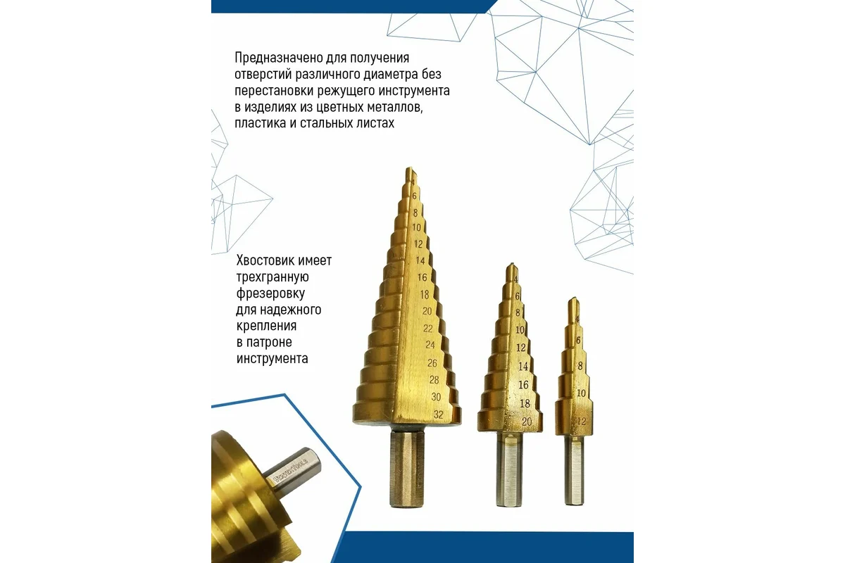 Набор ступенчатых сверл 4-12 мм, 4-20 мм, 4-32 мм vertextools 4-12-4-20-4-32 предназначен для получения отверстий различного диаметра без перестановки режущего инструмента в изделиях из цветных металлов, пластика и стальных листах.