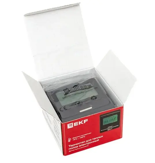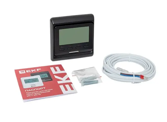 1. Термостат -1 шт. 2. Датчик пола с соединительным проводом (3 м) – 1 шт. 3. Крепежные винты – 2 шт. 4. Паспорт-1 шт.Техническая спецификация