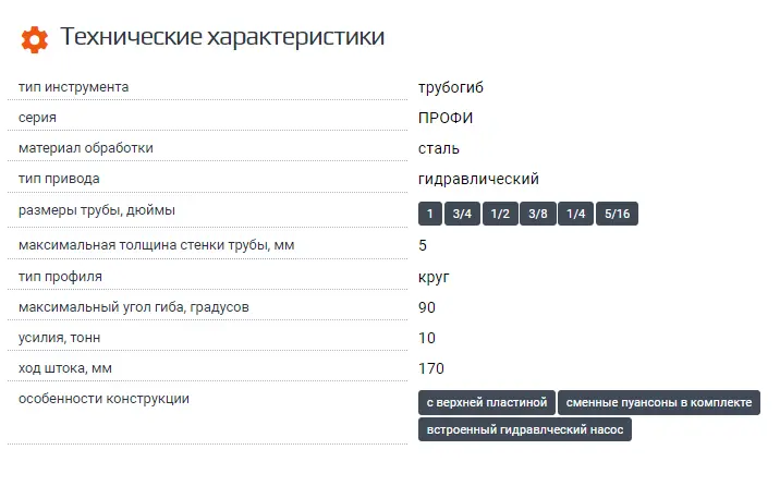 | SKU | товарные позиции | Тип инструмента | Серия | Материал обработки | Тип привода | Размеры трубы, дюймы | Максимальная толщина стенки трубы, мм | Тип профиля | Максимальный угол гиба, градусов |