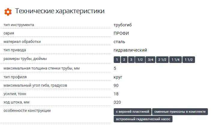 | SKU | товарные позиции | Тип инструмента | Серия | Материал обработки | Тип привода | Размеры трубы, дюймы | Максимальная толщина стенки трубы, мм | Тип профиля | Максимальный угол гиба, градусов |