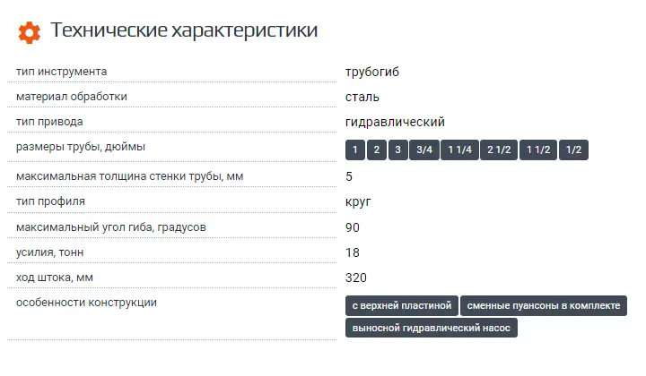 | SKU | товарные позиции | Тип инструмента | Материал обработки | Тип привода | Размеры трубы, дюймы | Максимальная толщина стенки трубы, мм | Тип профиля | Максимальный угол гиба, градусов |