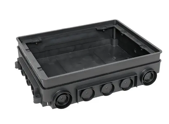 Коробка напольная под лючок C-Line 24. Используется с лючком C-Line 12 и C-Line 24 (cl-ln-12 и cl-ln-24). Предназначена для монолитных бетонных полов, ввод кабеля с помощью электромонтажных труб и/или металлического лотка. Предназначен для бетонного слоя 80 - 95 мм. Требуемая высота коробки устанавливается посредством увеличения высоты внутреннего вкладыша с помощью шурупов по углам коробки. В комплекте идет укрывающая пластина, защищающая коробку от попадания бетона при заливке.