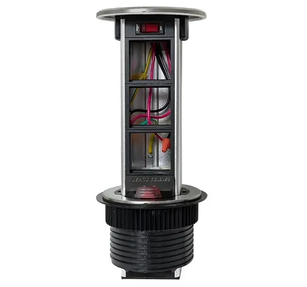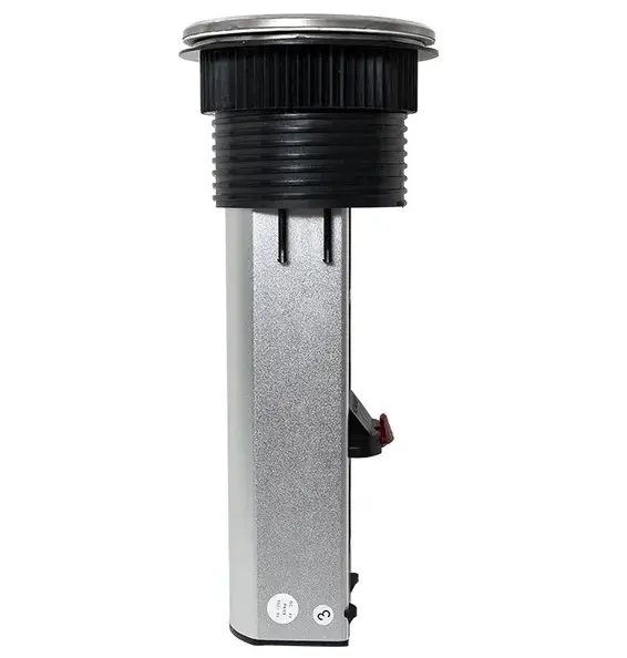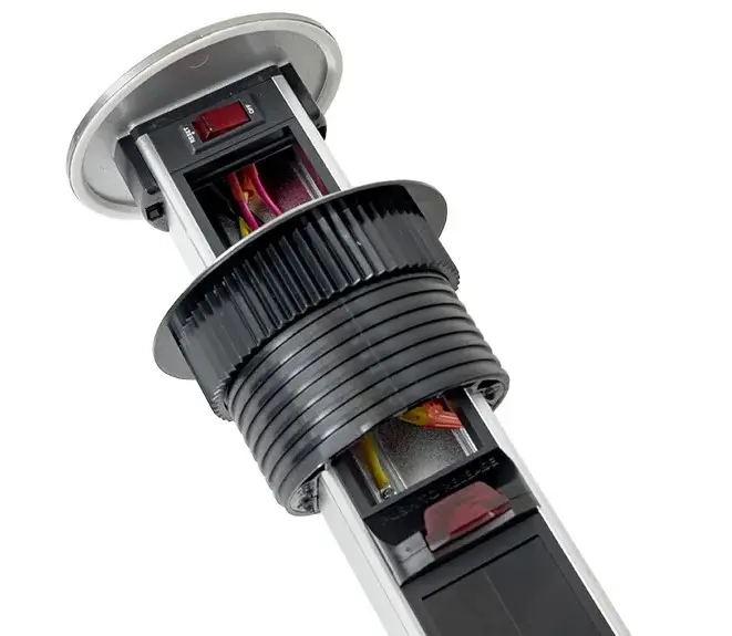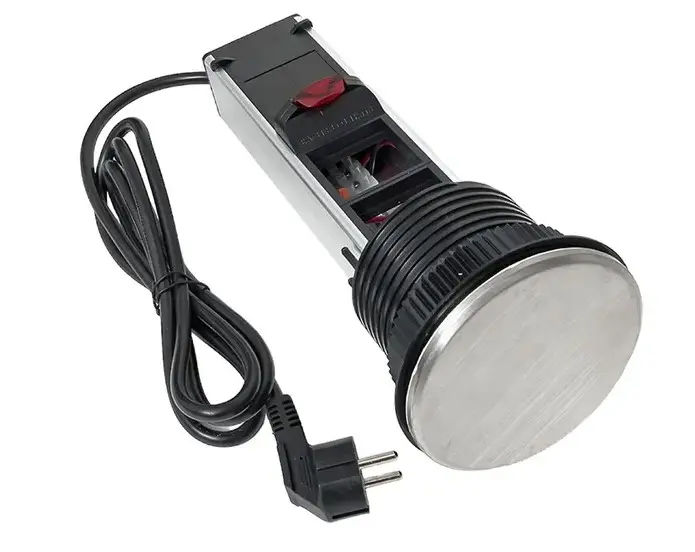 Встраиваемая мини-колонна, 6 модулей C-Line. Встраиваемая мини-колонна – это изделие цилиндрической формы с ручным выдвижным механизмом, предназначенное для установки ЭУИ стандарта 45х45. Изделие поставляется в комплекте с сетевым кабелем питания (2 метра). В нижней крышке колонны предусмотрены 2 дополнительных кабельных ввода. Монтаж производится в предварительно подготовленное отверстие диаметром Ø95-100 мм. Допустимая толщина поверхности стола 10-45 мм.