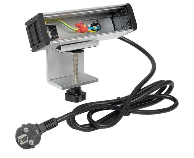Встраиваемый настольный розеточный блок для крепления к столу, 8 модулей, C-Line. Настольный розеточный блок для крепления к столу – изделие прямоугольной формы, предназначенное для установки модульных ЭУИ. Розеточный блок монтируется на струбцину и крепится к краю стола. Сетевой кабель питания (2 метра) и струбцина в комплекте. На задней стенке розеточного блока предусмотрено дополнительное отверстие для подведения слаботочных кабельных линий.