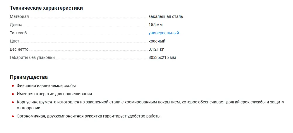 Конструкция позволяет надежно фиксировать извлекаемую скобу, что обеспечивает высокую скорость и безопасность работ.