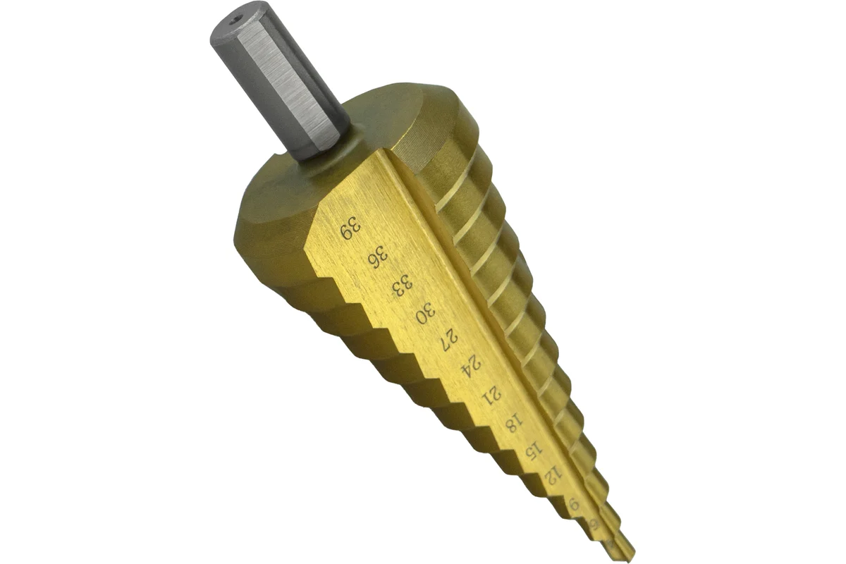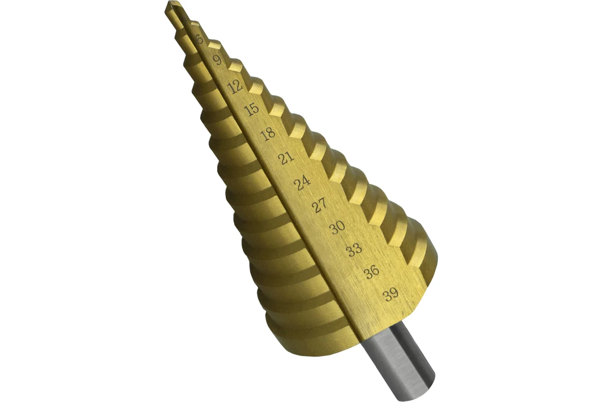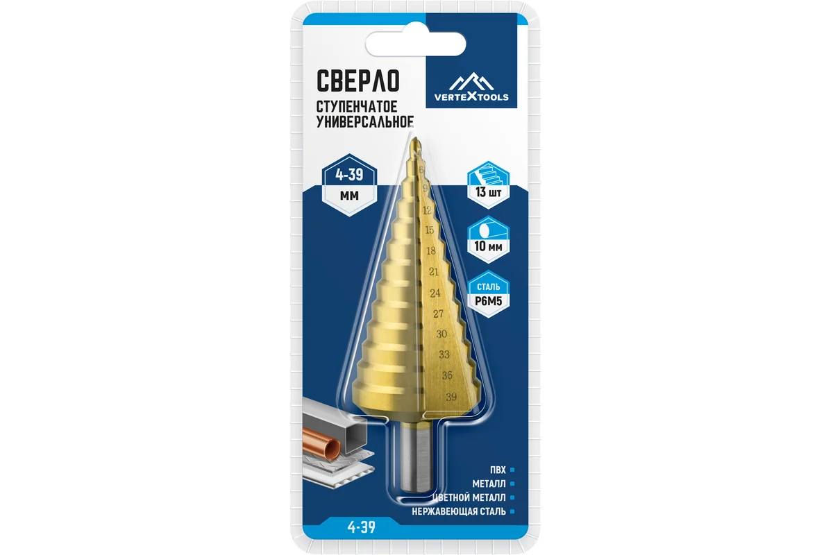 Сверло ступенчатое (4-39 мм; шаг 3 мм) Vertextools4-39 изготовлено из высококачественной быстрорежущей стали Р6М5 и предназначено для получения отверстий в листовых металлических и пластиковых материалах. Покрытие нитридом титана значительно увеличивает сопротивление перегреву во время сверления исрок службы сверла. Рекомендуется работать с использованием смазочно-охлаждающих жидкостей. Диаметр сверления 4-39 мм, шаг 3мм.