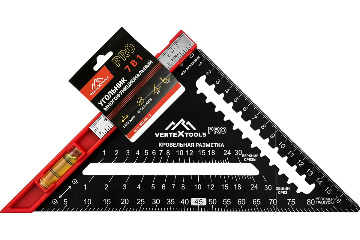 Угольник VERTEXTOOLS PROFI это универсальный, многофункциональный измерительный инструмент 7 в 1. Предназначен для точной и быстрой разметки столярных, слесарных заготовок и стропильных систем.
