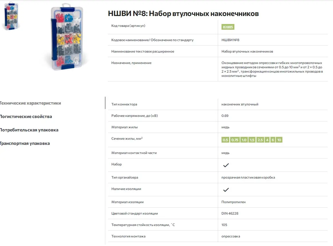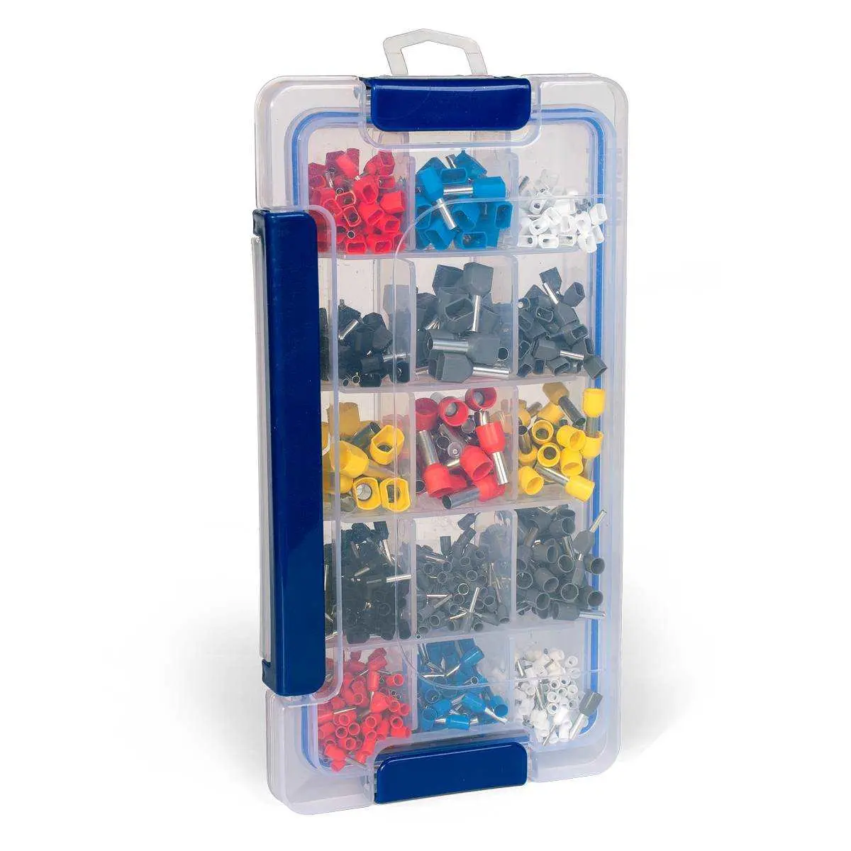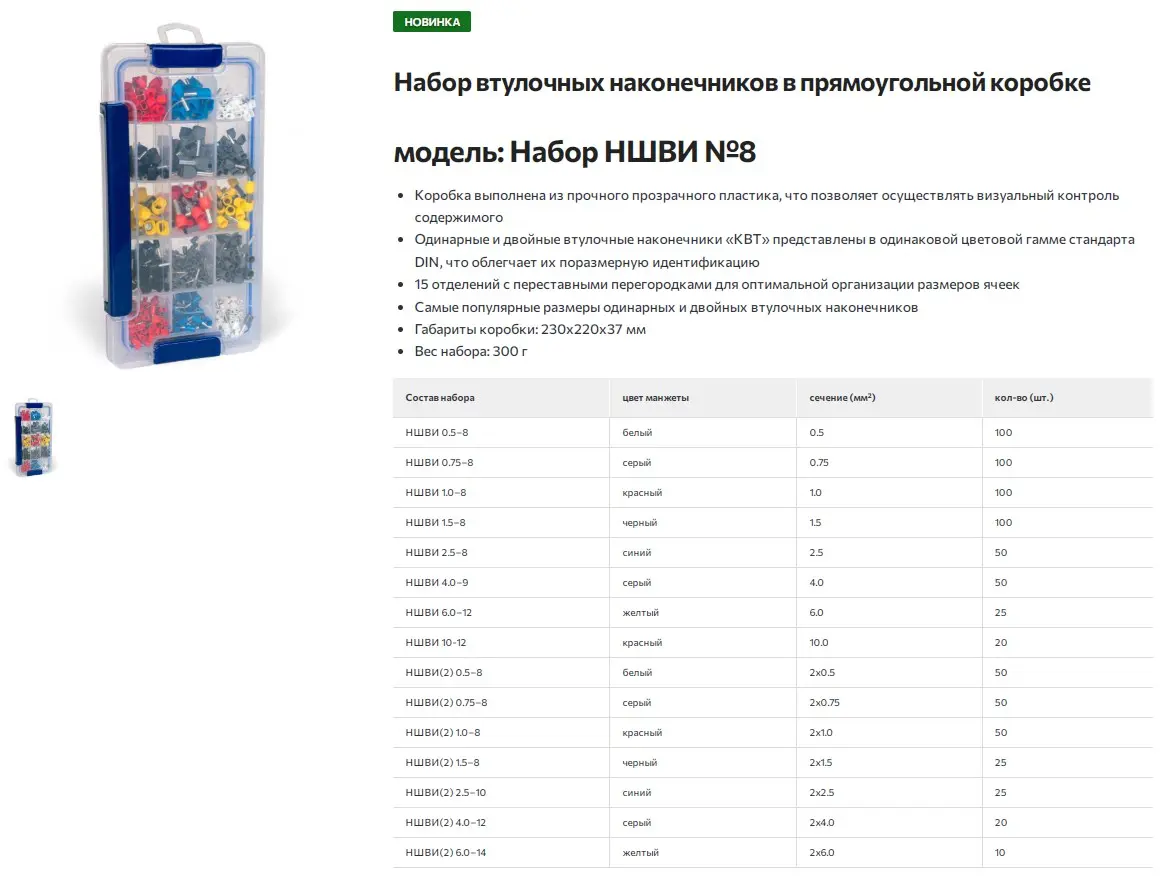- Конструкция кейса данного набора отлична от предыдущих. Двенадцать отделений с пятью фиксированными перегородками и одной переставной – для оптимальной организации размеров ячеек. С одной стороны имеется крепежная петля для подвешивания коробки на стене. Набор включает в себя наконечники НШВИ сечением от 0,5 до 6 мм² и наконечники НШВИ(2) сечением от 0,5 до 2,5 мм²